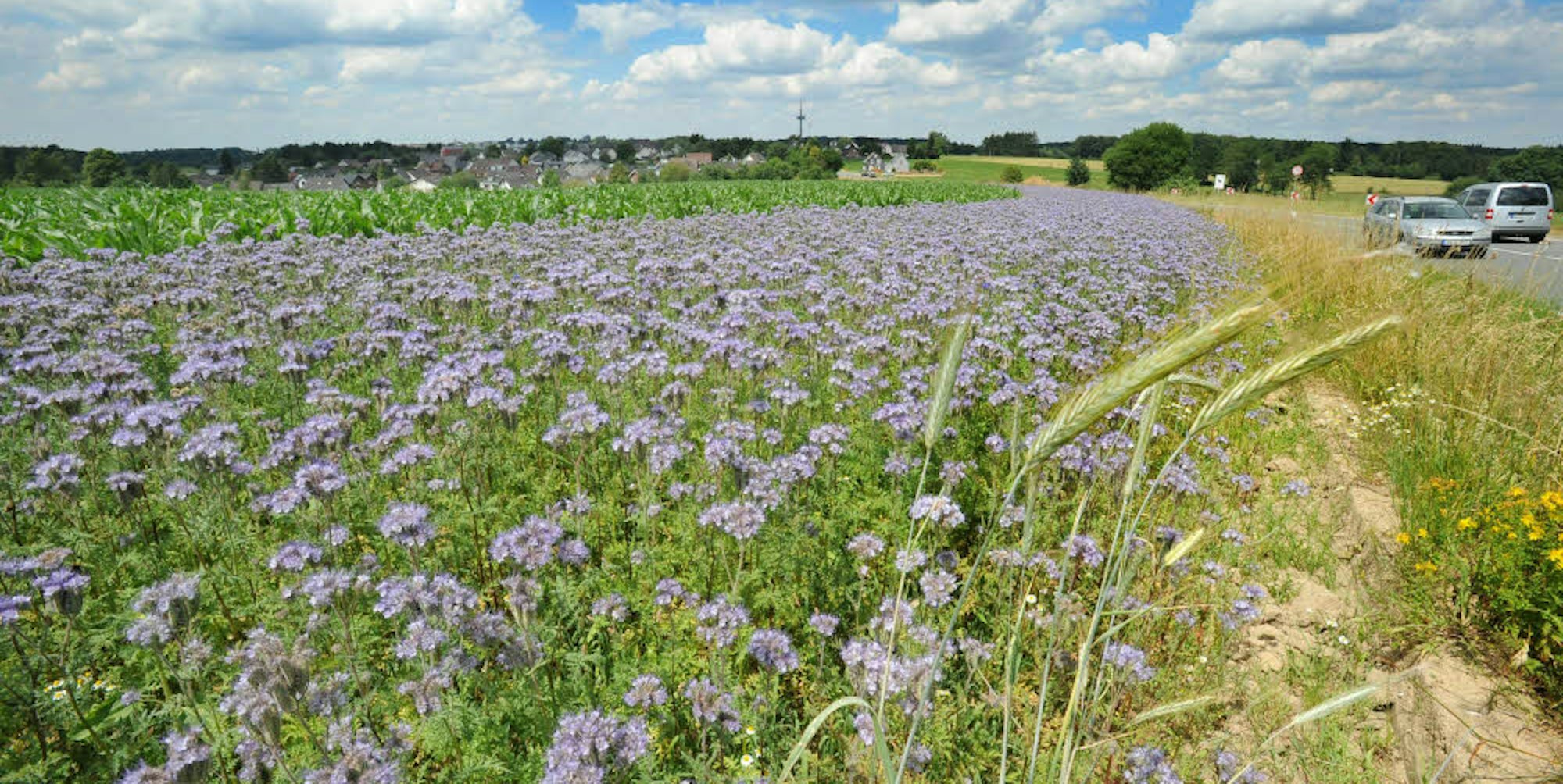 Landwirt Klaus Tiedmann hat den Blühstreifen angelegt. Und erntet dafür Lob von allen Seiten. Ein Meer aus blau-violetten Phacelia-Blüten, die ein Maisfeld einrahmen, erfreut links am Straßenrand jeden, der aus Richtung Hilgen nach Witzhelden fährt. „Wunderschön“, „super Sache“, „mega“, „großartig“, „sooo toll“, „und auch noch sehr nützlich“ überschlagen sich die Kommentatoren in Facebook-Foren und auf Tiedmanns Seite mit Danksagungen.