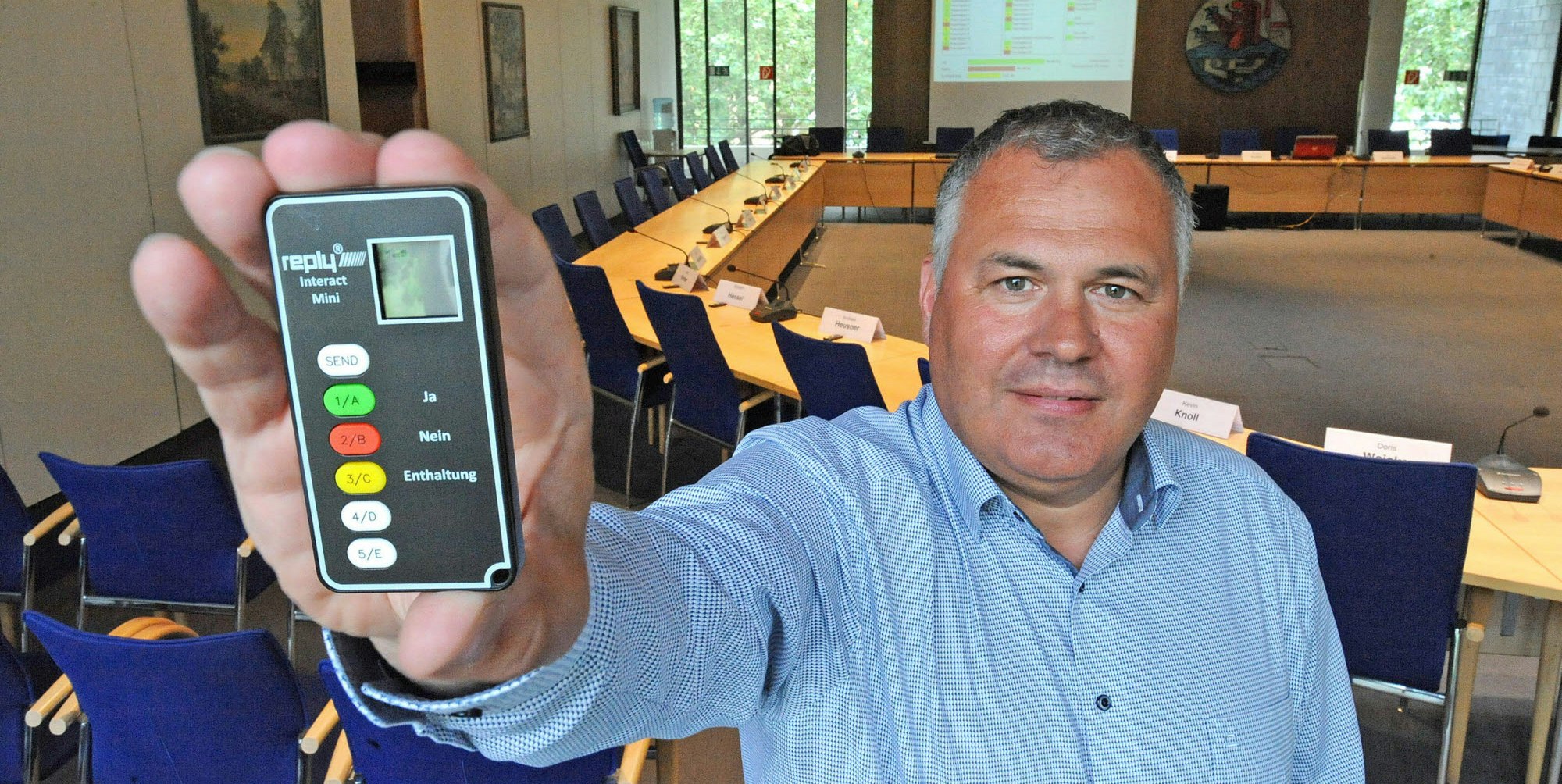 „Immer wieder gab es Unstimmigkeiten, weil Hände nur halb gehoben wurden, übersehen oder auch gar nicht gehoben wurden,“ blicken Bürgermeister und Protokollanten auf zeitraubende Zählmanöver zurück: „Das ist nun vorbei. Mit den neuen Abstimmungsgeräten werden die Stimmen direkt digital erfasst und auf die beiden Leinwände im Ratssaal geworfen.“