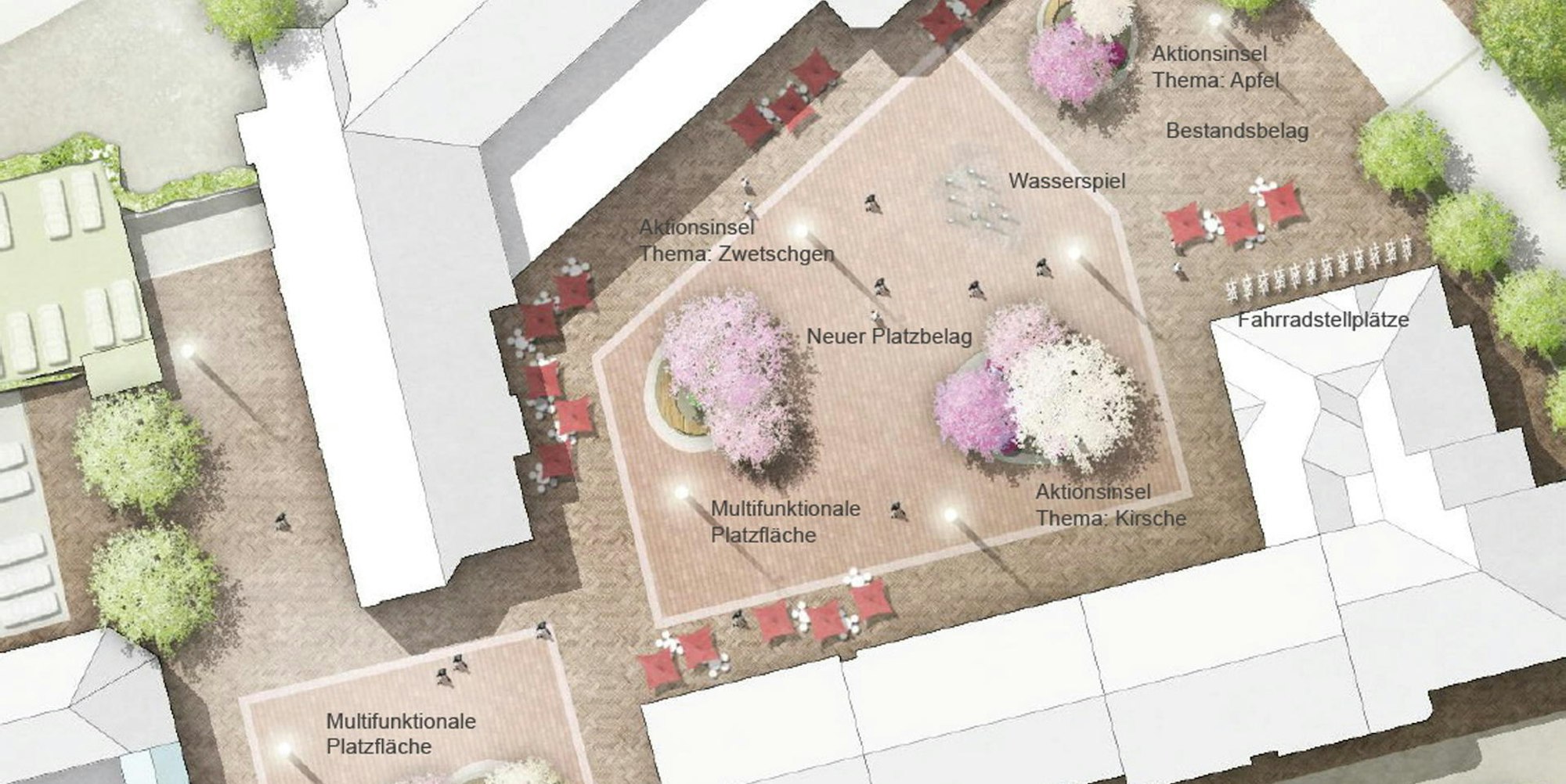 Der Entwurf für den Marktplatz umfasst neues Pflaster, vier Obstbaum-Inseln mit Sitzgruppen und ein Wasserspiel.