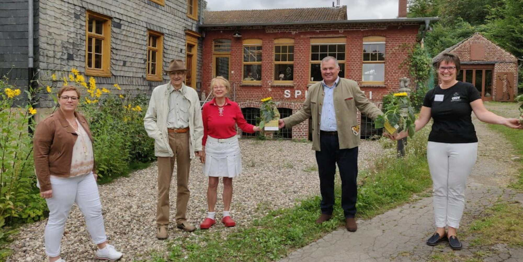 Sabine Claßen (KSK-Stiftung), Wolfgang Brudes und Wicze Braun, Frank Steffes und Andrea Brüster vom Jugendverband Crew (v.l.) bei der Spendenübergabe mit Sonnenblumen im Sinneswald.