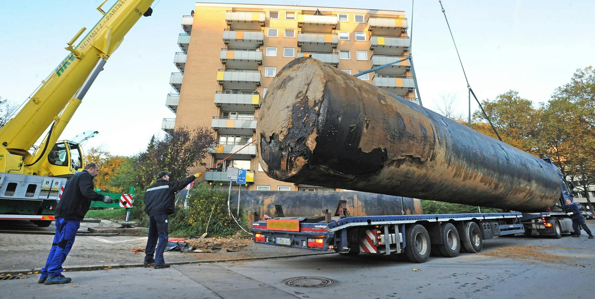 Tonnenschwer lagen sie wie bizarre Skulpturen mehr als drei Monate lang im Vorgarten eines Hochhauses an der Straße Am Büscherhof. Am Donnerstag rückten schließlich Arbeiter mit Schwerlastkran und drei 25 Meter langen Sattelschleppern an, sperrten die Straße ab und transportierten die jeweils 20 Tonnen schweren Behälter einzeln ab. Sie werden nun nach Süddeutschland verfrachtet und werden dort für die künftige Nutzung als Löschwassertanks aufbereitet.