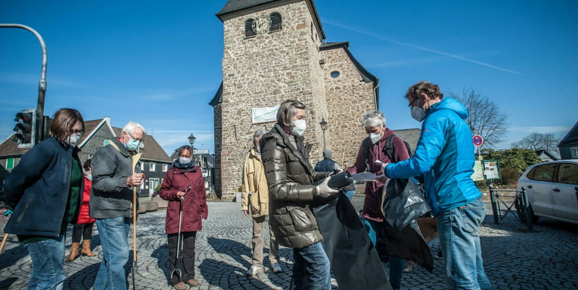 Mit Müllsäcken und Ortsplänen stattete die stellvertretende VVV-Vorsitzende Sigrid Weltersbach (Mitte) die zwei Dutzend freiwilligen Müllsammler aus, die in Witzhelden aufräumten.