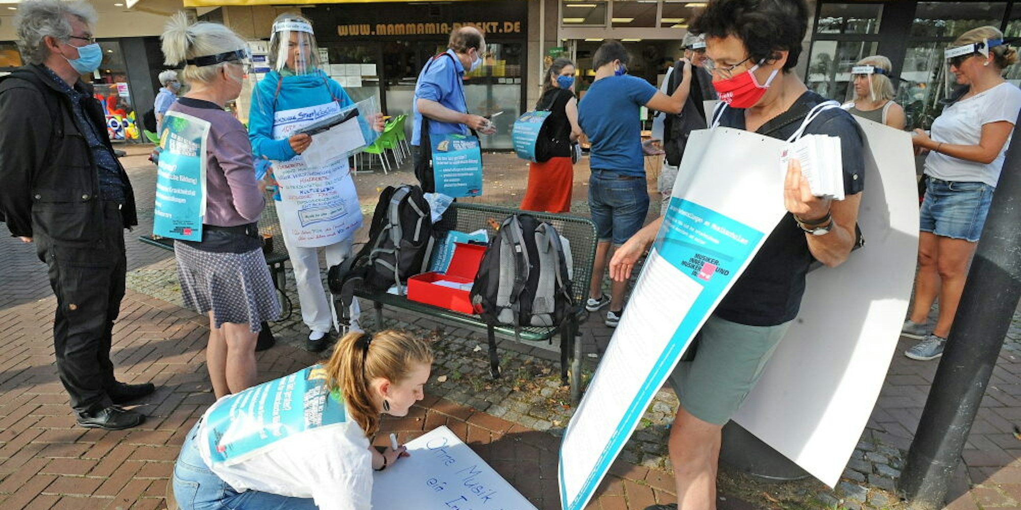 Dozentinnen und Dozenten der Leichlinger Musikschule bei ihrer Protestaktion am Samstag auf dem Marktplatz.