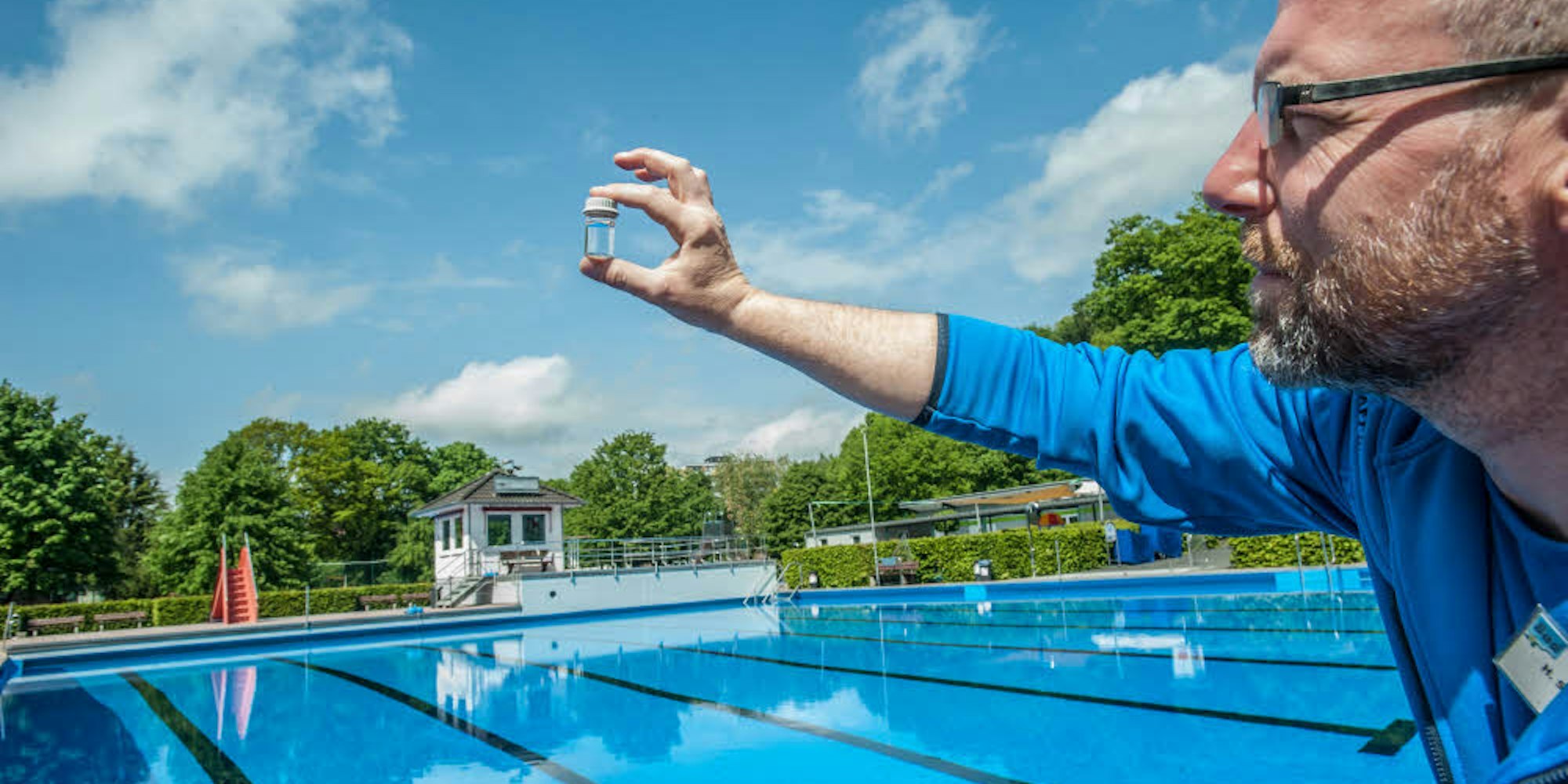 Helge Schönzeler, hier bei einer Wasserprobe am Becken, ist neuer Betriebsleiter des Leichlinger Schwimmbades.