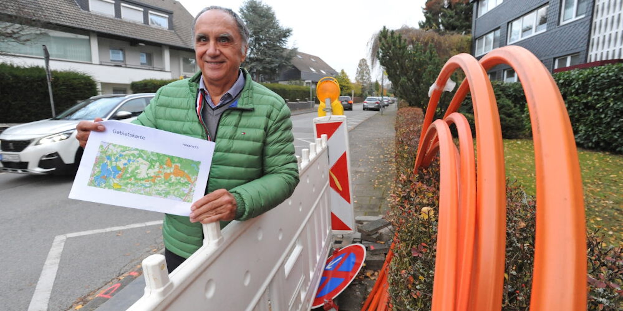 Der Breitband-Beauftragte der Stadt, Reiner Pliefke, mit der Glasfaser-Netzkarte an der aktuellen Baustelle an der Sperberstraße.