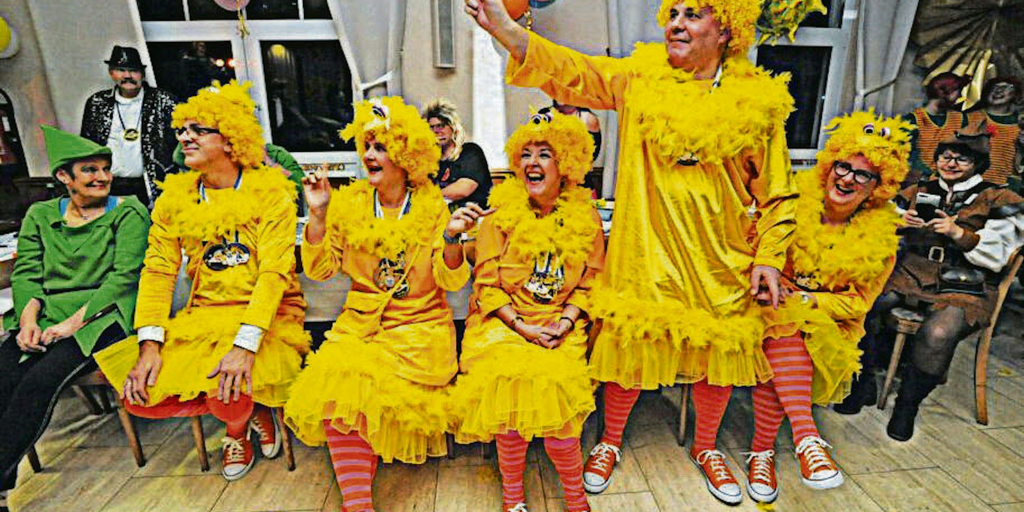 Prinz Matthias I. beim Einzug in Haus Klippenberg bei der Kostümsitzung des Festkomitees – und Bürgermeister Frank Steffes und Freunde, die ihn in „Bibo“-Kostümen empfingen.