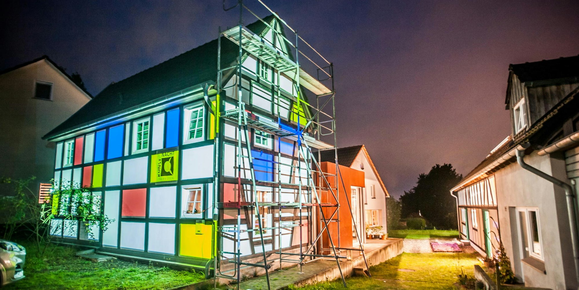 Leverkusen – Während in Opladen Funken und Worte fliegen und aus vielen Ecken Wiesdorfs Musik schallt, geht es am östlichsten Ende der 17. Leverkusener Kunstnacht ruhiger zu. Nacheinander färben sich einzelne weiße Rechtecke zwischen den dunklen Balken des Fachwerkhauses in rot, gelb oder blau - bis das ganze Haus am Edelrather Weg 188 aussieht wie ein Gemälde von Piet Mondrian.