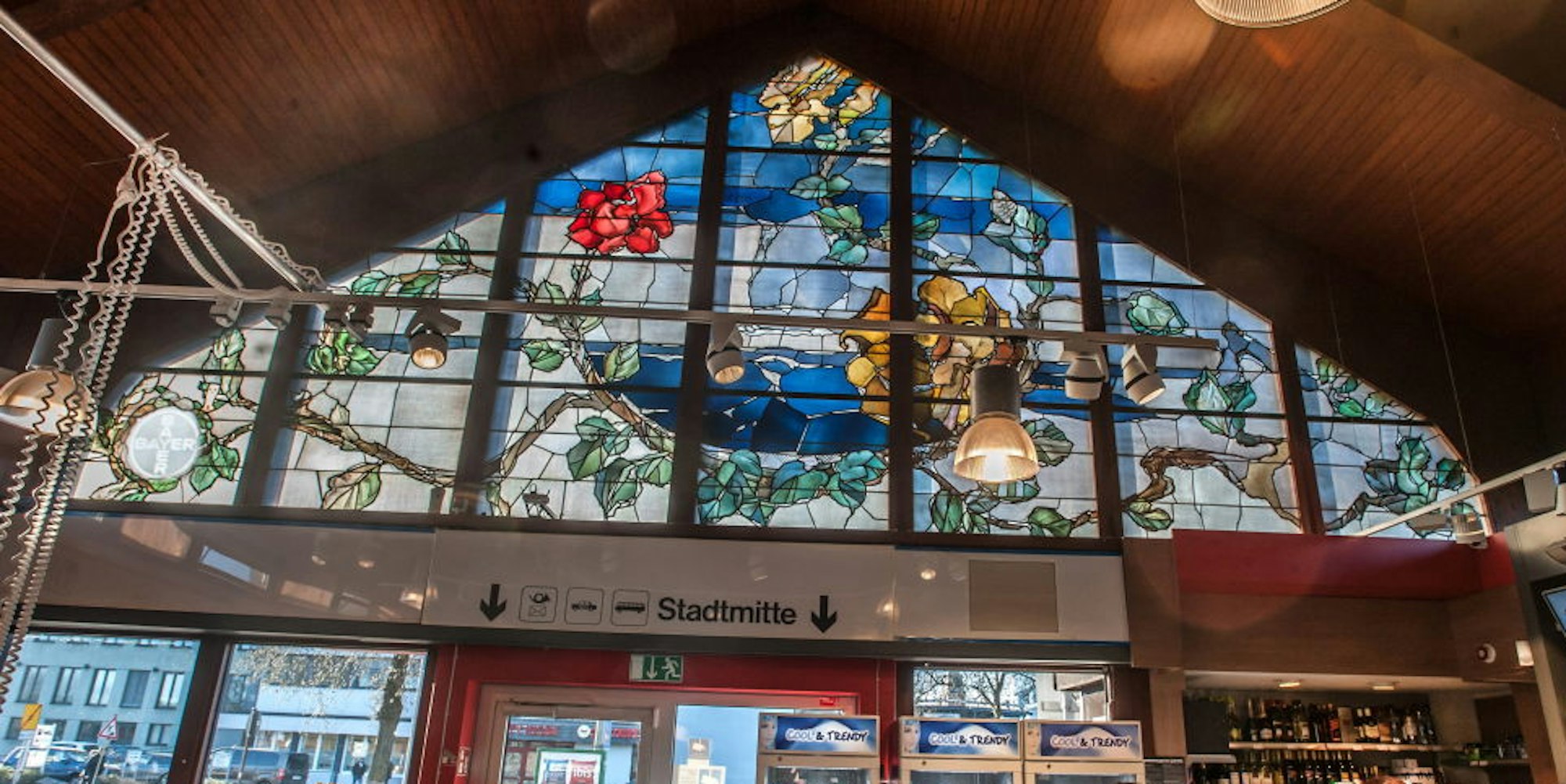Zurzeit sind ein Kiosk und ein Fahrkartenverkauf in der Schalterhalle. 2021 soll sie abgebrochen werden, jedenfalls nach Pelzers Informationen. Das Fenster wurde 1980 eingebaut. Es wurde von Bayer gesponsert, deshalb gibt es unten links ein kleines Bayerkreuz im Glas. Das Fenster könne später etwa in ein neues städtisches Gebäude eingebaut werden, so die Vorstellung der Stadtgeschichtlichen Vereinigung. (rar)