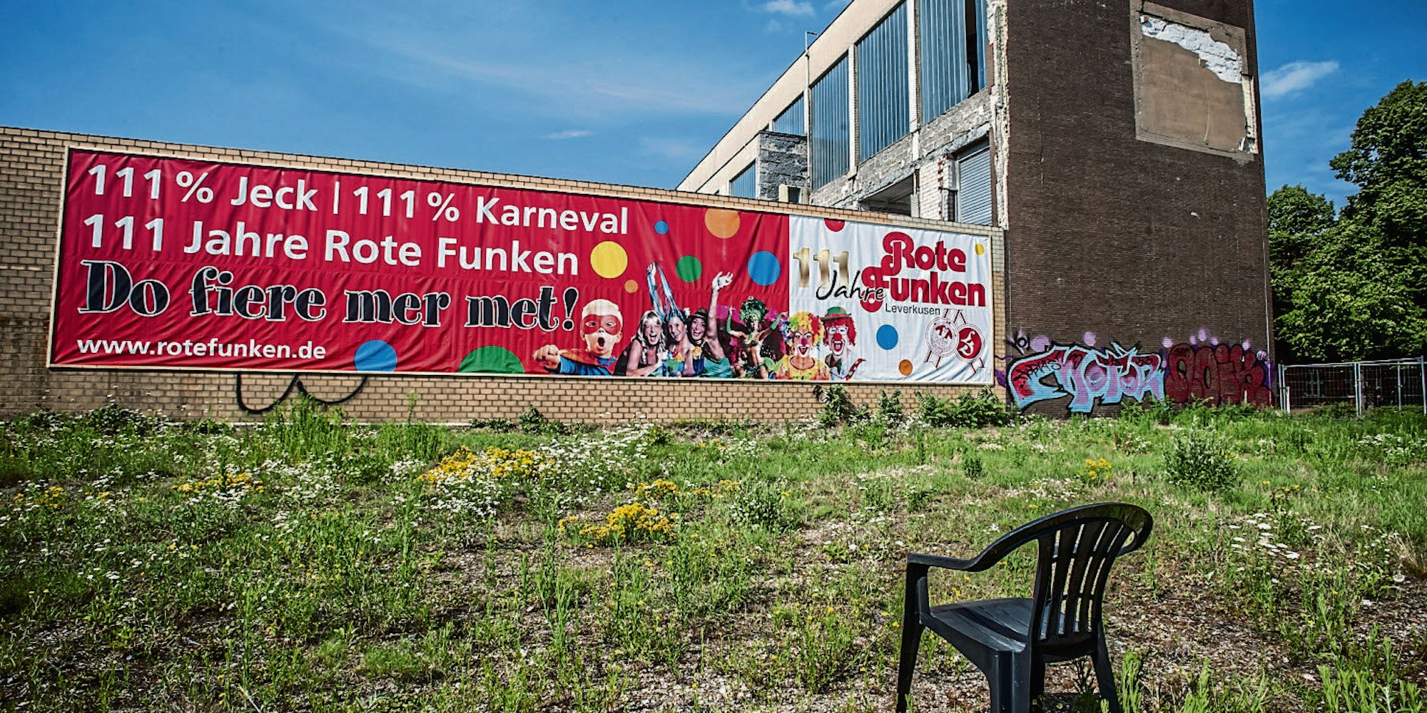 Ein großes Banner an der Wand der Ganser-Brauerei kündet vom Überlebenswillen der Roten Funken Leverkusen.