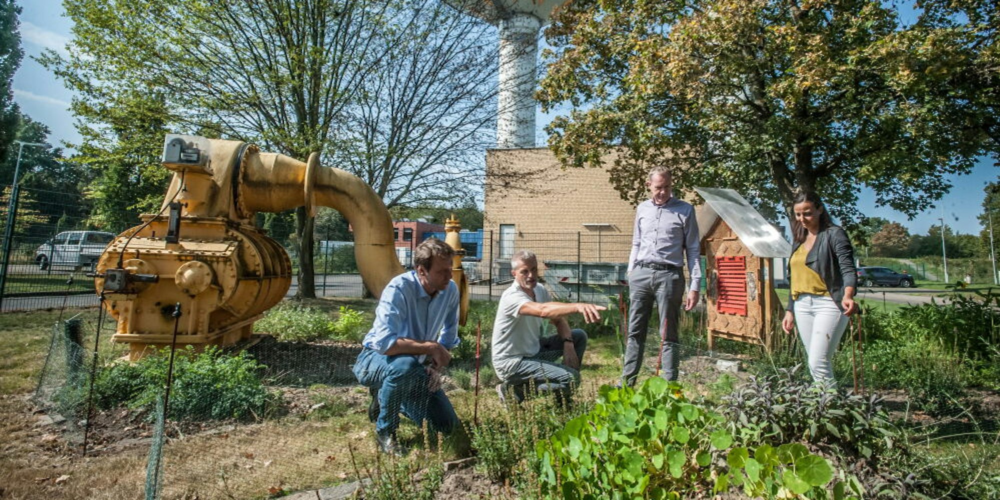 Mehr Bienen und Blumen will die EVL anlocken. Gebaut hat die Insektenhäuschen EVL-Mitarbeiter Stephan Eßer (2.v.l.)