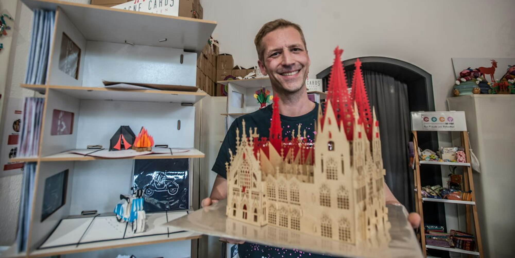 Leverkusen – Eigentlich hätte das kleine Ladenlokal in der Schulstraße schon im März öffnen sollen. Es war alles fertig, das Lager gut bestückt, die Regale aufgestellt. Doch dann kam Corona. Drei Monate länger als geplant musste Roland Bellinghausen auf die Eröffnung seines Ladens warten. Seit nunmehr fünf Jahren stellt Bellinghausen mit seinem Start-up Cologne Cards 3D Pop-up-Karten in fair gehandelter Handarbeit her. Klappt man die Karte auf, baut sich ein kleines, filigran gearbeitetes Kunstwerk auf.