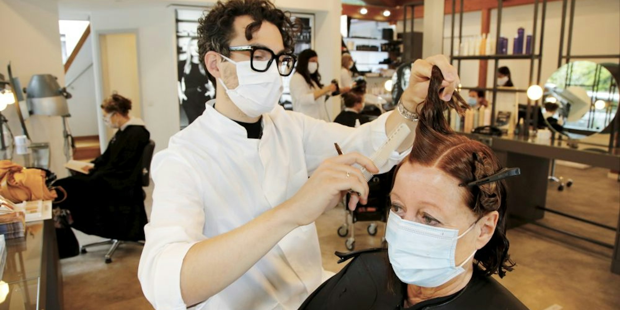 Einiges muss an diesem Morgen noch ausprobiert werden: Wie wäscht man Haare, ohne dass die Gesichtsmaske des Kunden nass wird? Wie schneidet man die Haare hinter den Ohren? Erster Lösungsansatz: Der Kunde muss die Maskenhalterung hinter den Ohren entfernen und die Maske kurz mit den Händen am Gesicht festhalten, bis die Ohren wieder frei sind.