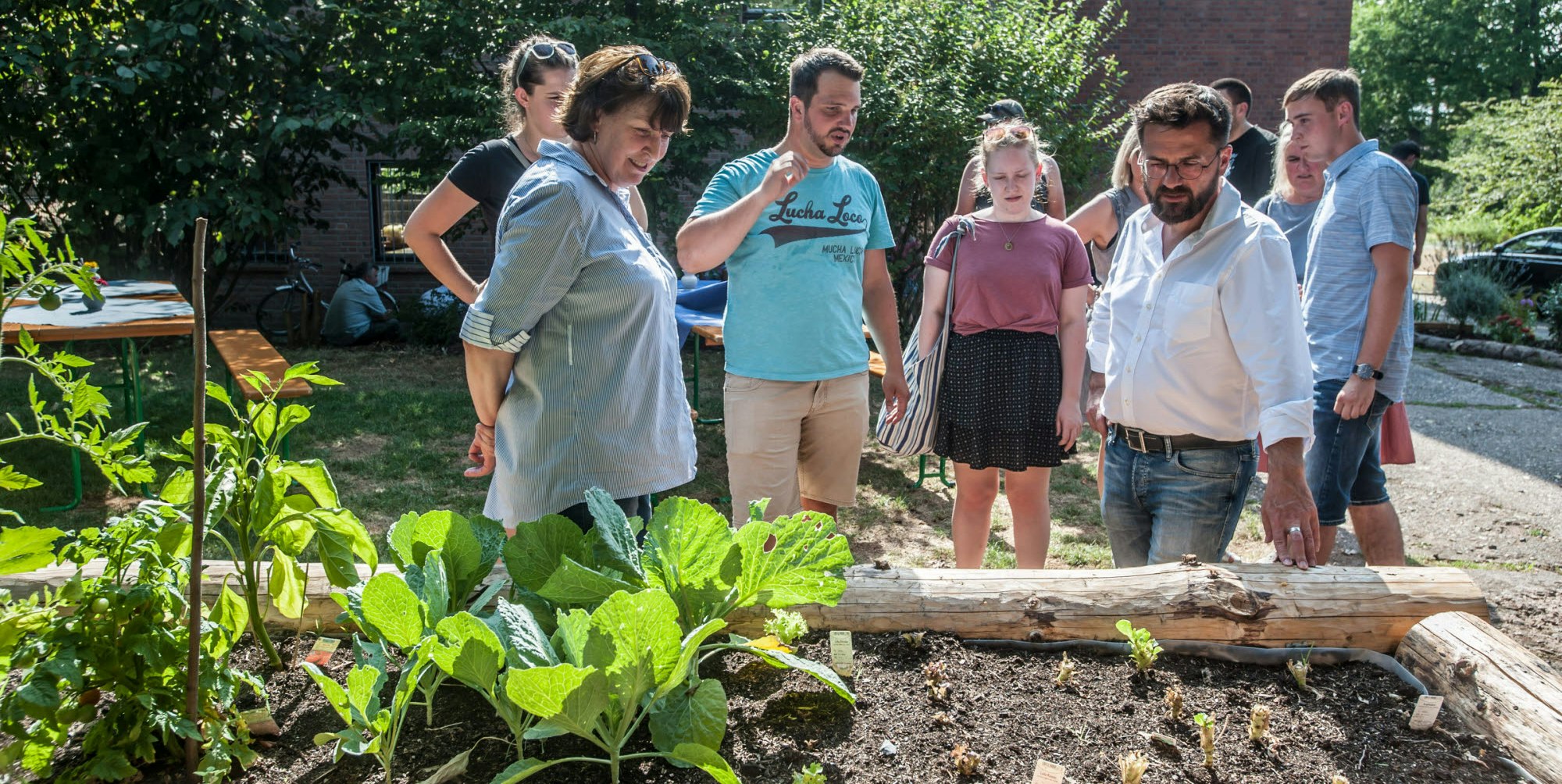 Was gedeiht im Hochbeet? Eva Lux (links) und Thomas Kutschaty (Zweiter von rechts) machen sich schlau.