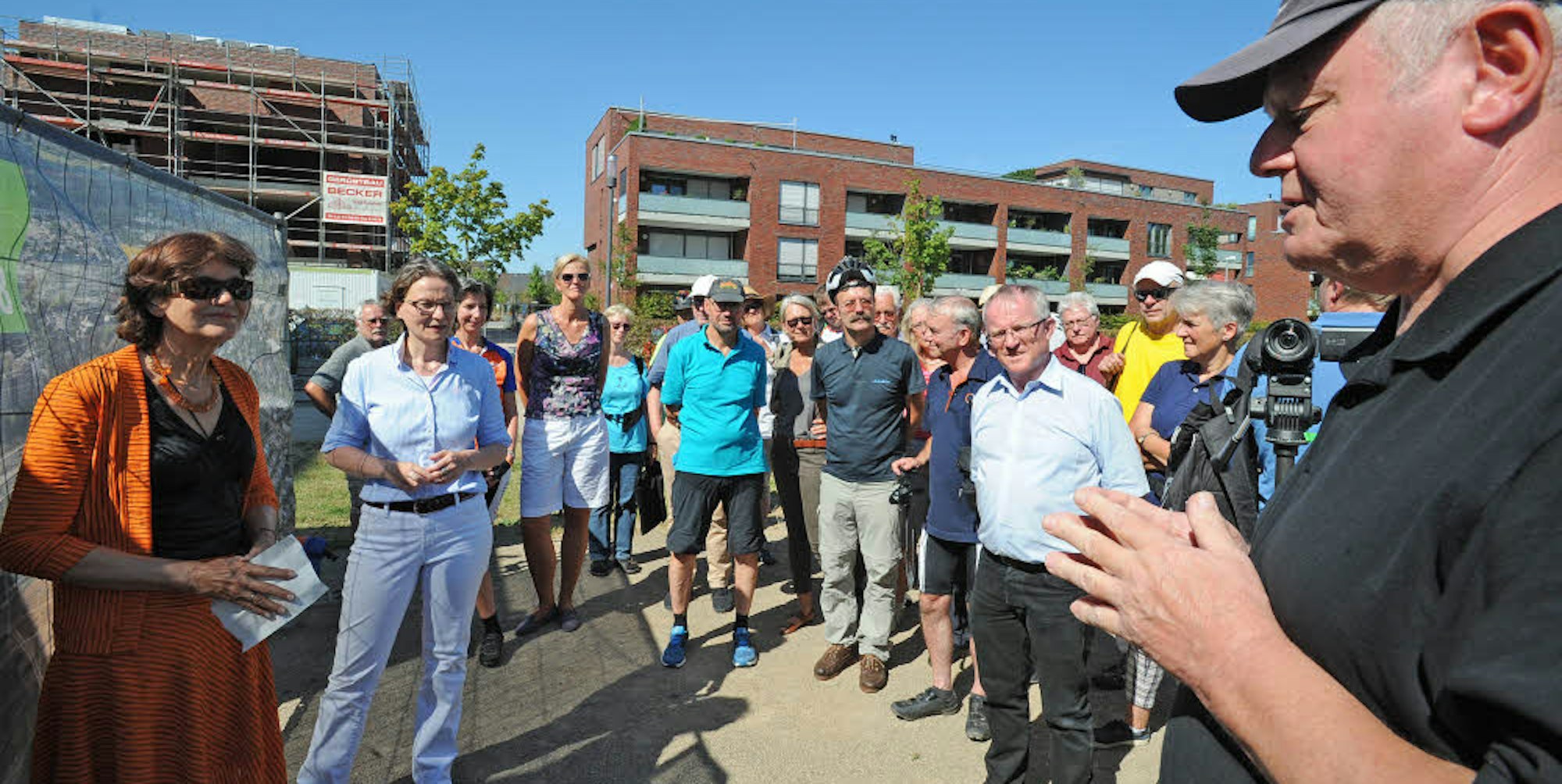 In der Neuen Bahnstadt erfuhr NRW-Heimatministerin Ina Scharrenbach (2.v.l.) von Bahnstadt-Geschäftsführerin Vera Rottes (l.) alles über das Städtebauprojekt.