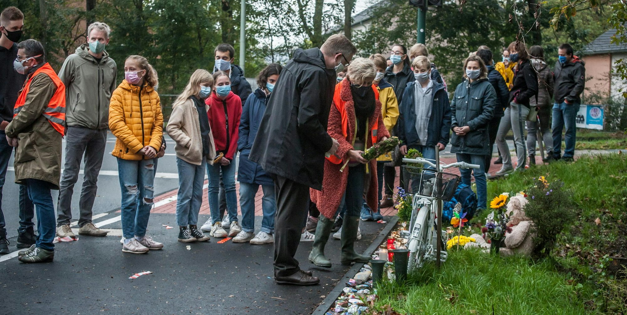 Die dritten und vierten Klassen der Fontane-Grundschule kommen mit ihren Lehrerinnen über den Weg, den Myrna nahm, laufen über die Ampel an dem Ghostbike vorbei. Ein Blatt mit Dietrich Bonhoeffers Worten „sei wunderbar geborgen“ steckt an den Pedalen. Bunt bemalte Steine sind davor abgelegt, Kerzen, Kränze und immer wieder packen die Familien mitgebrachte Blumen aus, um sie an das Rad zu legen.