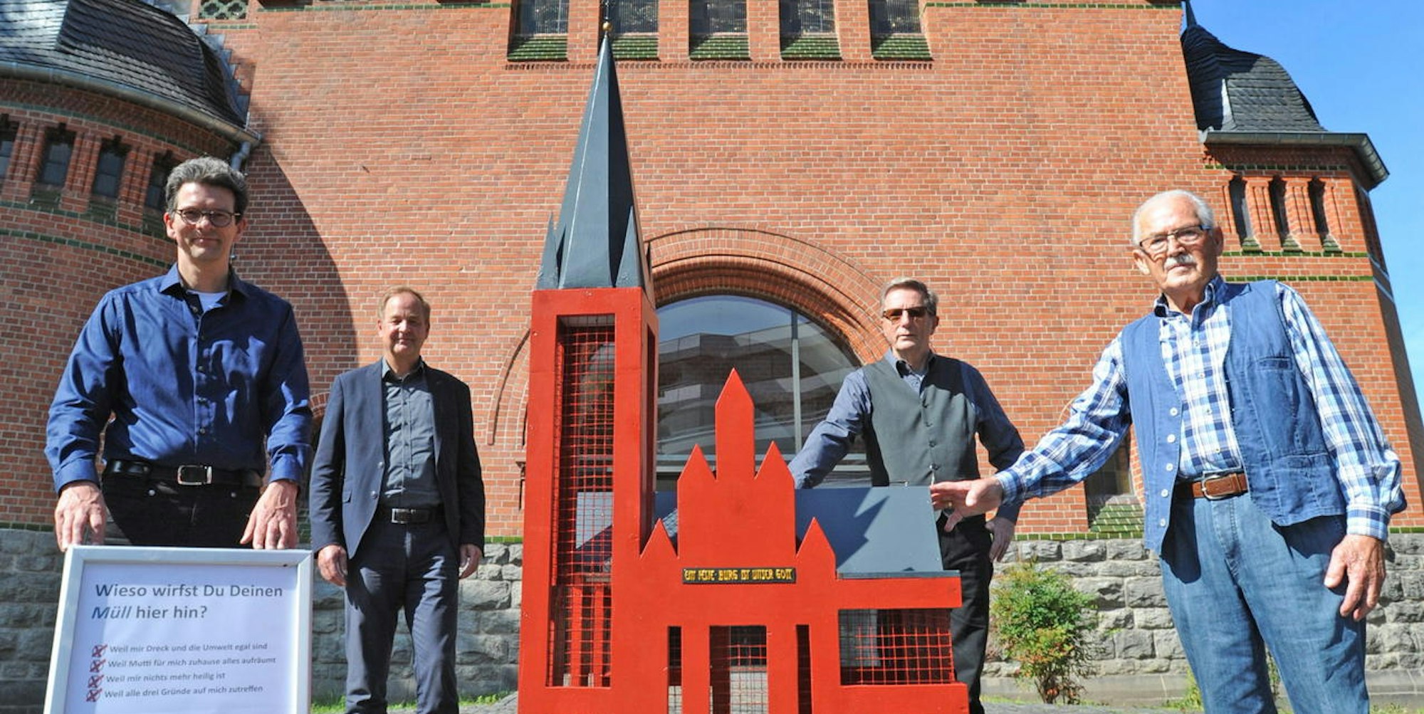 Detlev Prößdorf (v.l.), Ulrich Bornewasser, Manfred Buch und Peter Seiffert präsentieren die Christuskirche für den Müll.