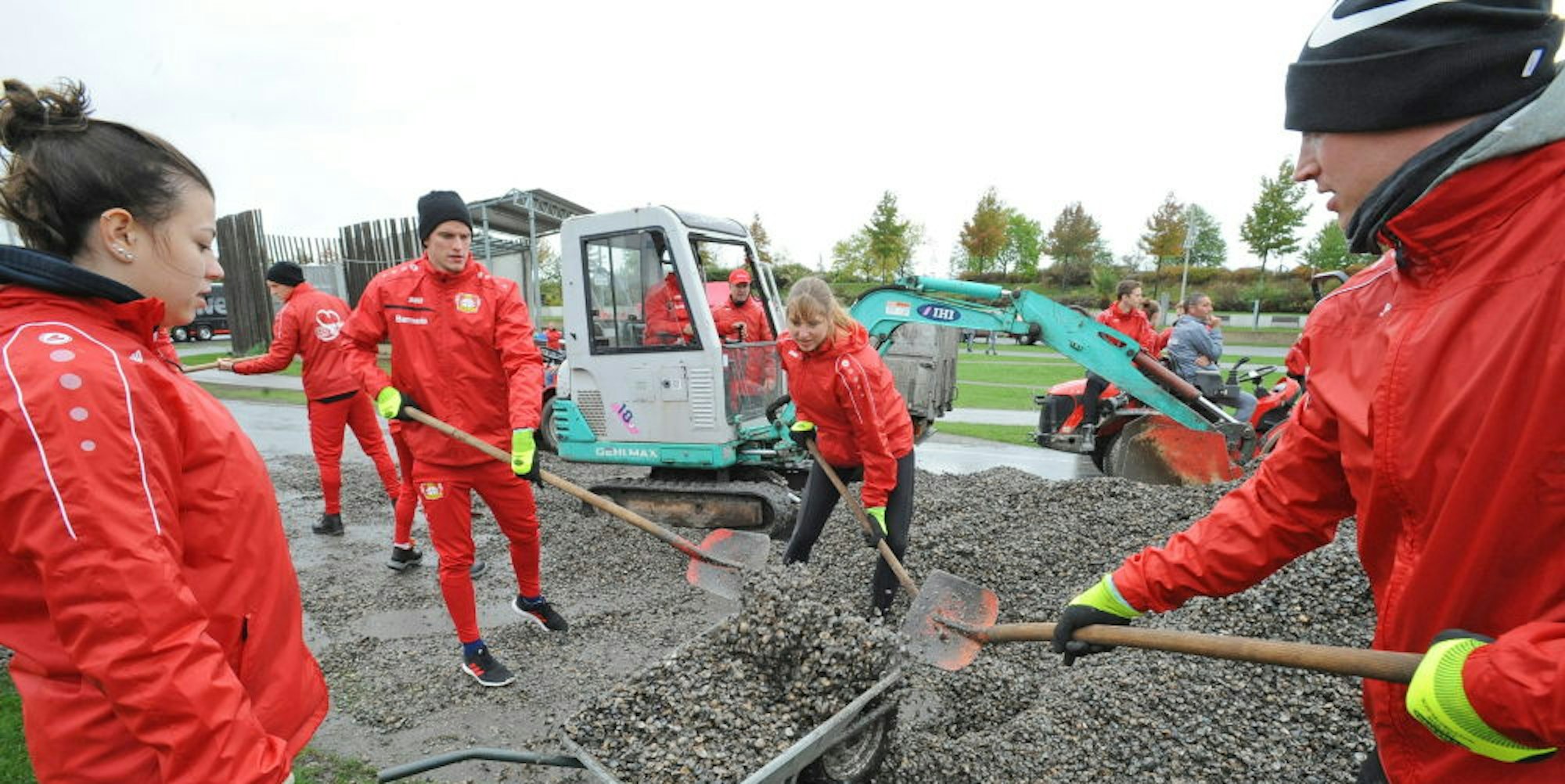 Um 14 Uhr fährt der Werkself-Bus vor und die Mannschaft gesellt sich dazu. Die Mitarbeiter haben ihnen noch etwas Arbeit übrig gelassen; die Bender-Brüder Lars und Sven packen sogleich tatkräftig mit an. Manch anderer muss erst noch eingesetzt werden, man schaut beim Baggern und Schaufeln zu. Dann werden die restlichen Muscheln herumgekarrt und mit Harken ebenmäßig verteilt. Eine motorisierte Schubkarre tuckert wie ein kleiner Trecker die Wege entlang.
