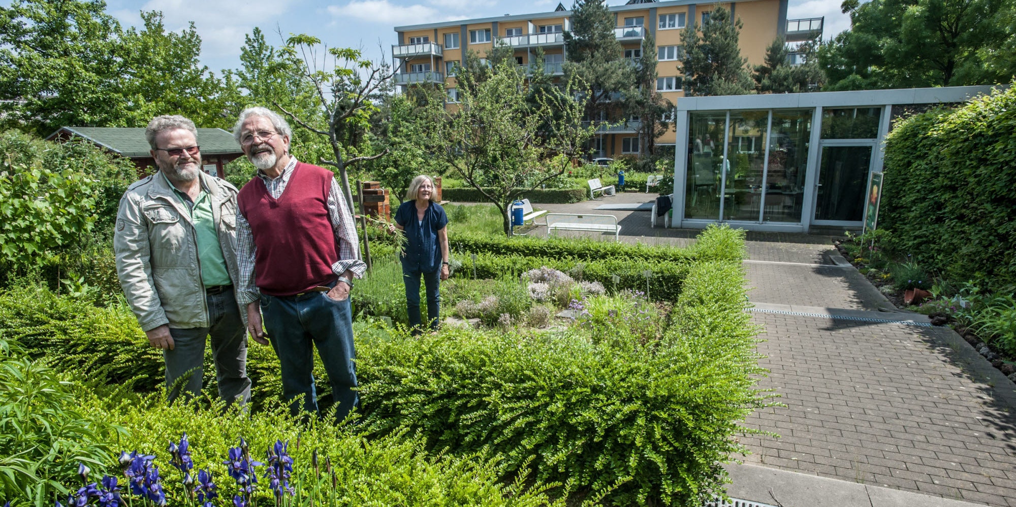 Imker Reiner Höller (links) und das Ehepaar Eichhorn in dem prächtig bewachsenen Garten des Neuland-Parks.