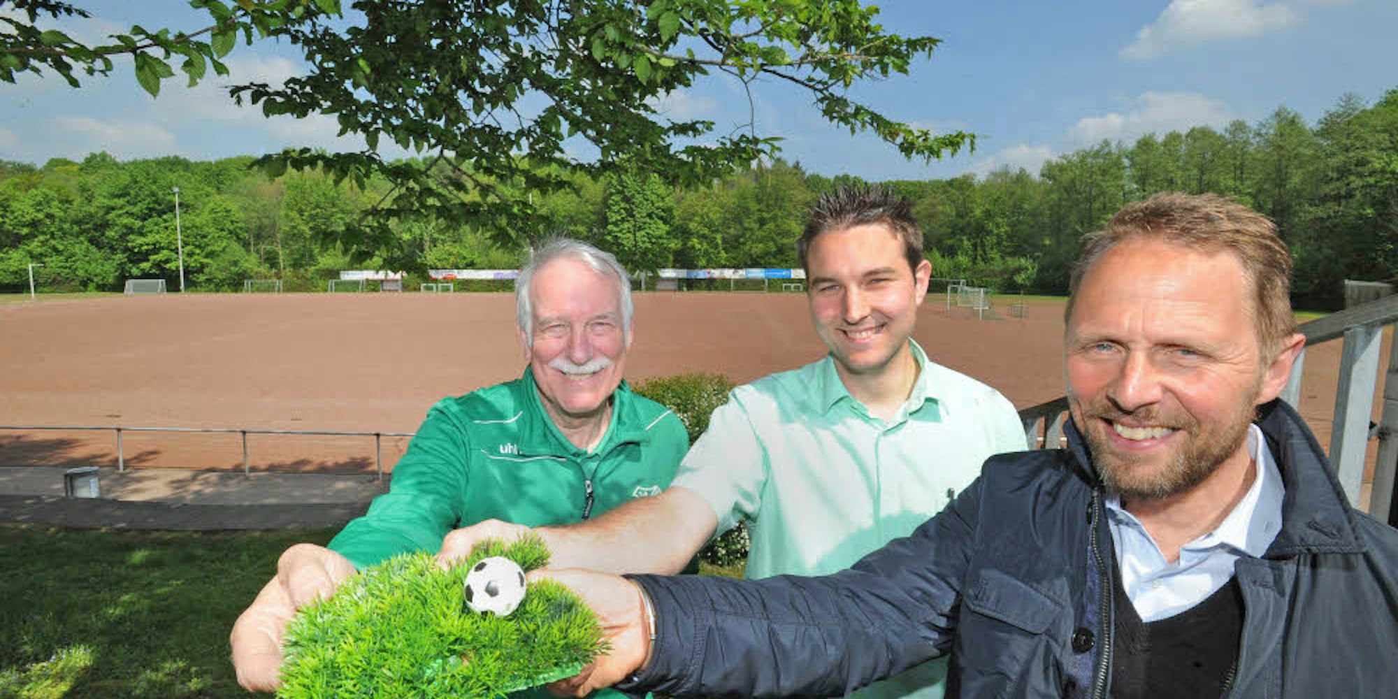 Beisitzer Ferdinand Niebel, TuS-Vorstandsvorsitzender Arne Kahr und Oberbürgermeister Uwe Richrath (von links) freuen sich über die Modernisierung der Anlage in Quettingen