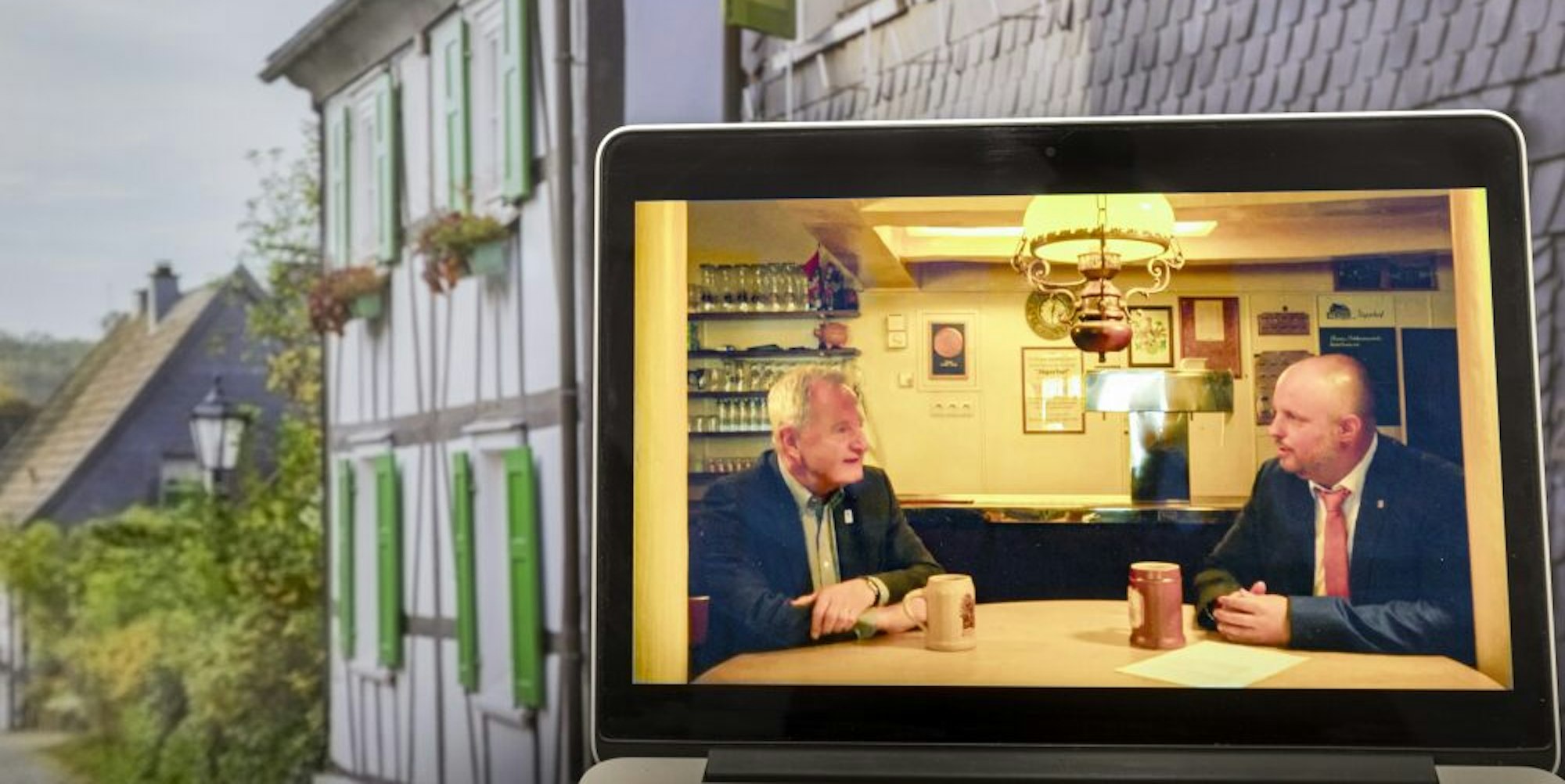Nach knapp einer Stunde live via Internet übertragener humorvoller Geschichtsstunde wurde Thul dann plötzlich offiziell, verließ kurz die Szenerie, um dann mit Buchers Ehefrau Hanne zurückzukehren und den „Talkshow-Gast“ mit dem Bergneustädter Stadtdukaten zu ehren.