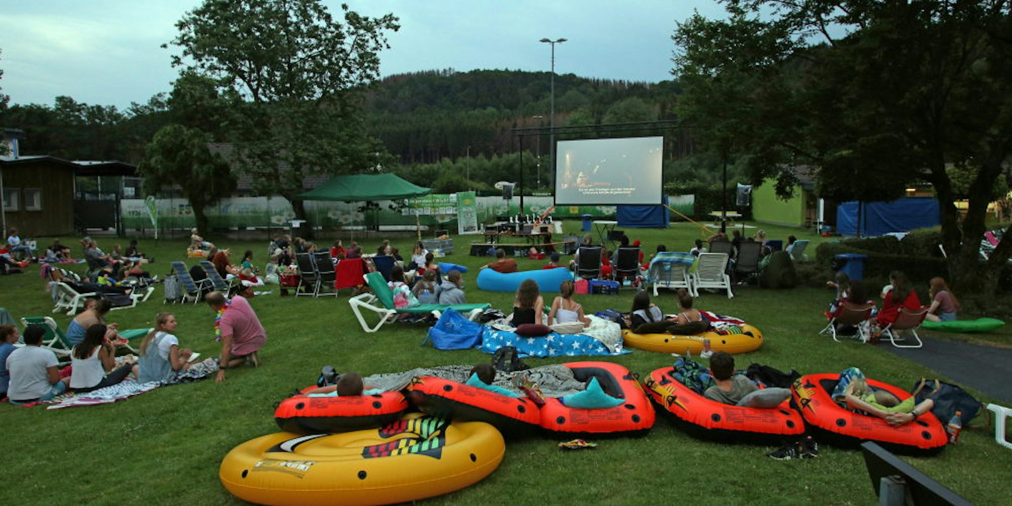 Mit einigen Sicherheitsmaßnahmen konnte das Schlauchbootkino als erstes größeres Event nach den Corona-Einschränkungen in Bielstein stattfinden: nicht auf dem Wasser, sondern auf der Liegewiese, mit sicherem Abstand zwischen den registrierten Besuchern.
