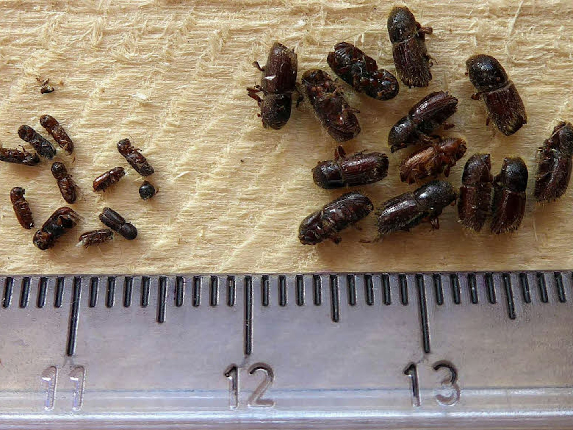 Klein, aber bedrohlich: Zwei Arten des Borkenkäfers haben die oberbergischen Fichten massenweise befallen, der Buchdrucker (r.) und der kleinere Kupferstecher.