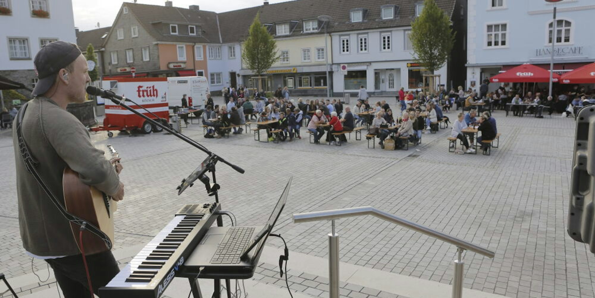 Wipperfürth – Beinahe wie bestellt lässt sich die Sonne am Samstagabend über dem Radium-Gelände blicken und taucht den Marktplatz in warmes Licht. Es ist 19.30 Uhr, als Philipp Hemmelmann den Verstärker zurechtrückt und zur Gitarre greift. Der Wipperfürther Musiksommer 2020 beginnt.