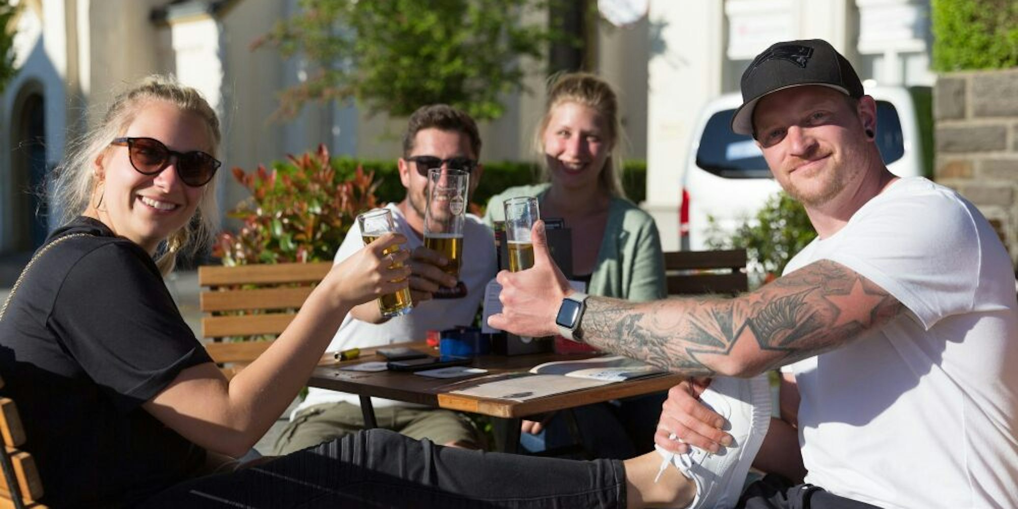 Auch die Freunde Michel Metzger, Lisa Grünwald sowie Julia und Thomas Knop befürworten die aktuellen Regeln. Die beiden befreundeten Paare sitzen vor dem Brauhaus. „Ich finde es richtig, dass es die Vorschriften gibt. Schließlich soll der Inzidenzwert trotz der Öffnungen weiter sinken. Unser Ziel ist es ja, den Virus, so gut es geht, einzuschränken und nicht weiter zu verbreiten“, so Thomas Knop.