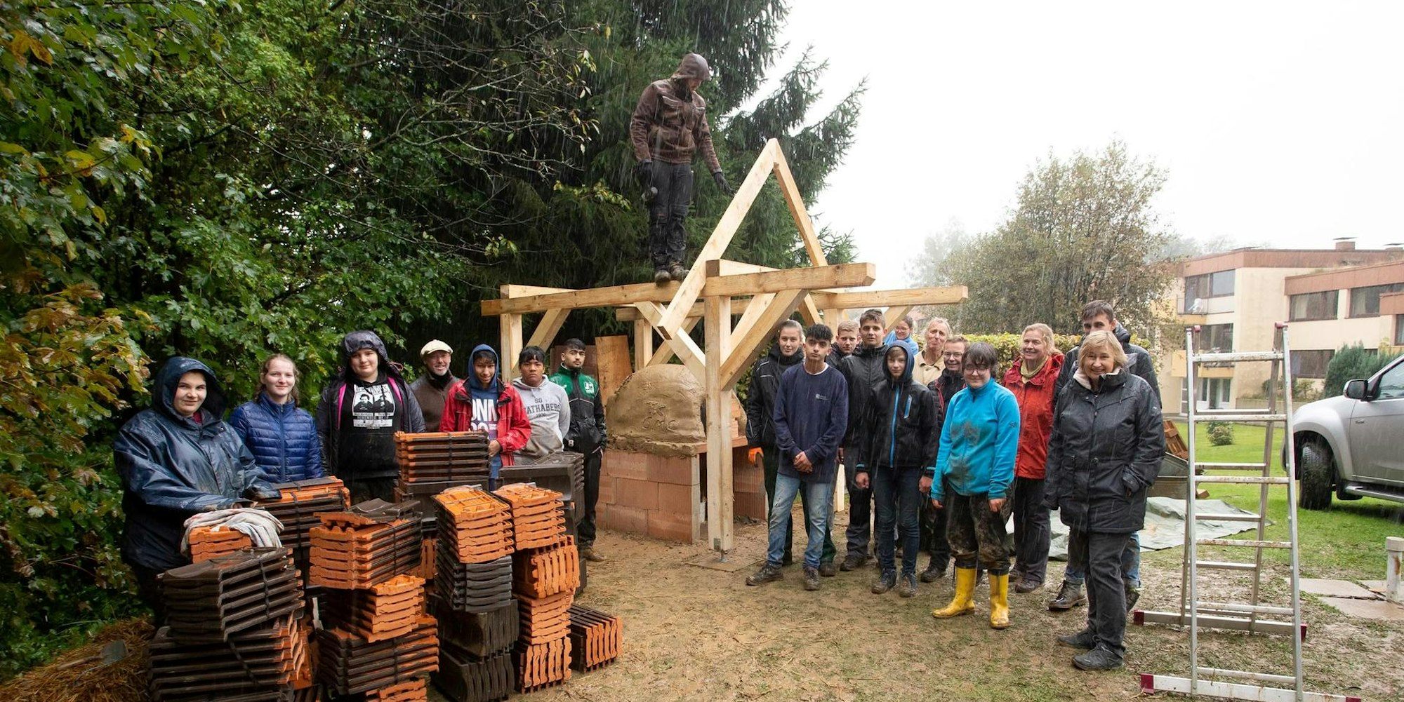 Unter dem Motto „Green Building for Future“ wird unter anderem ein Lehmbackofen samt Überdachung für das Naturfreundehaus Käte Strobel in Gummersbach-Lieberhausen gebaut. Unter der fachlichen Anleitung von Ofenbauer Stefan Theis wurde zunächst das Fundament fertiggestellt, bevor es am zweiten Tag mit Sockel und dem Backes selbst weiterging. Fleißig gingen die 14- bis 17-Jährigen dabei Theis zur Hand. „Der Ofen besteht aus fünf Schichten. Wir verwenden dafür Lehm, Stroh und Flies. Das Stroh dient dabei zur Wärmedämmung, sodass von außen kaum Wärme spürbar ist“, erklärte Theis.