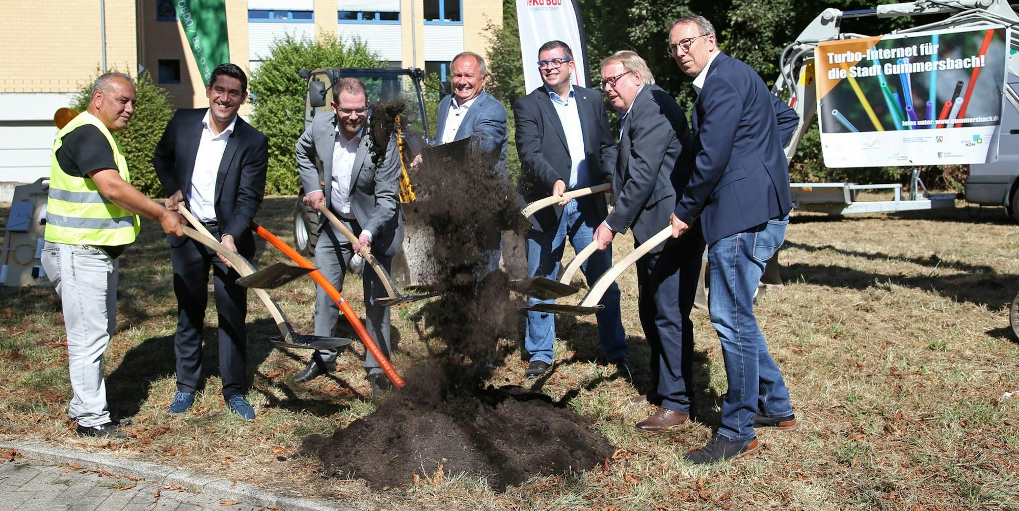 Beim Spatenstich am Dienstag griffen die Verantwortlichen zum Spaten. Mit dabei: Gummersbachs Bürgermeister Frank Helmenstein, sein Stellvertreter Jürgen Marquardt, Jürgen Hefner, Technischer Beigeordneter der Stadt Gummersbach, Tim Grebner, Fachdienstleiter Breitbandausbau, sowie Uwe Krabbe vom Unternehmen Greenfiber, Katharina Lankes von der Bezirksregierung Köln und Christoph Wegener von Athene Kom, dem Projektträger des Bundesministeriums für Verkehr und digitale Infrastruktur, sowie Vertreter der ausführenden Baufirma „TeKa Bau“.