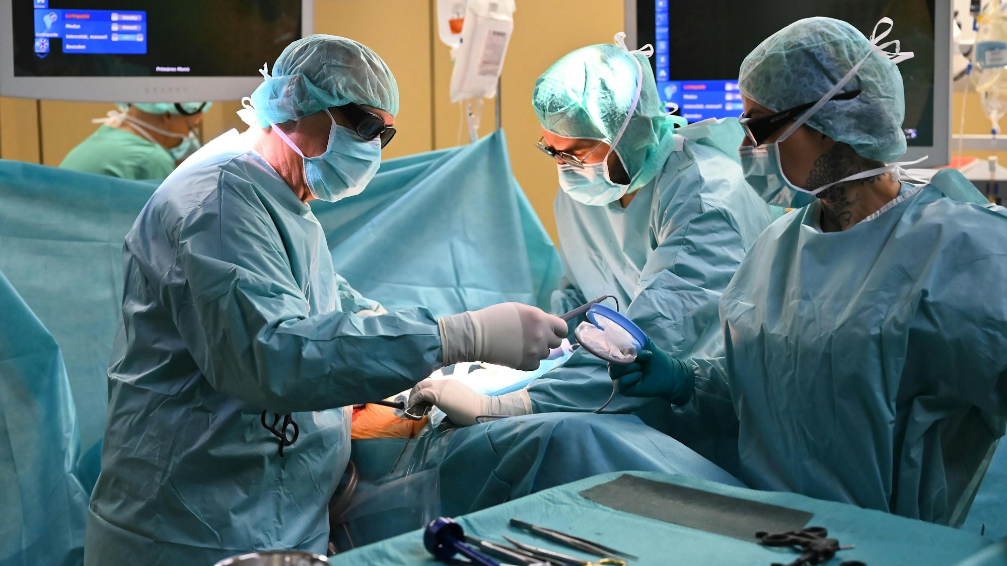 Kleine Schnitte genügen Prof. Stefan Saad (2.v.l.), um seine Instrumente in den Bauchraum der Patientin zu führen. Mit einer 3D-Brille kann er via einer Minikamera, die separat eingeführt wird, auf den Monitoren seine Arbeit am Darm der Patientin ganz genau verfolgen und seine Schnitte setzen.