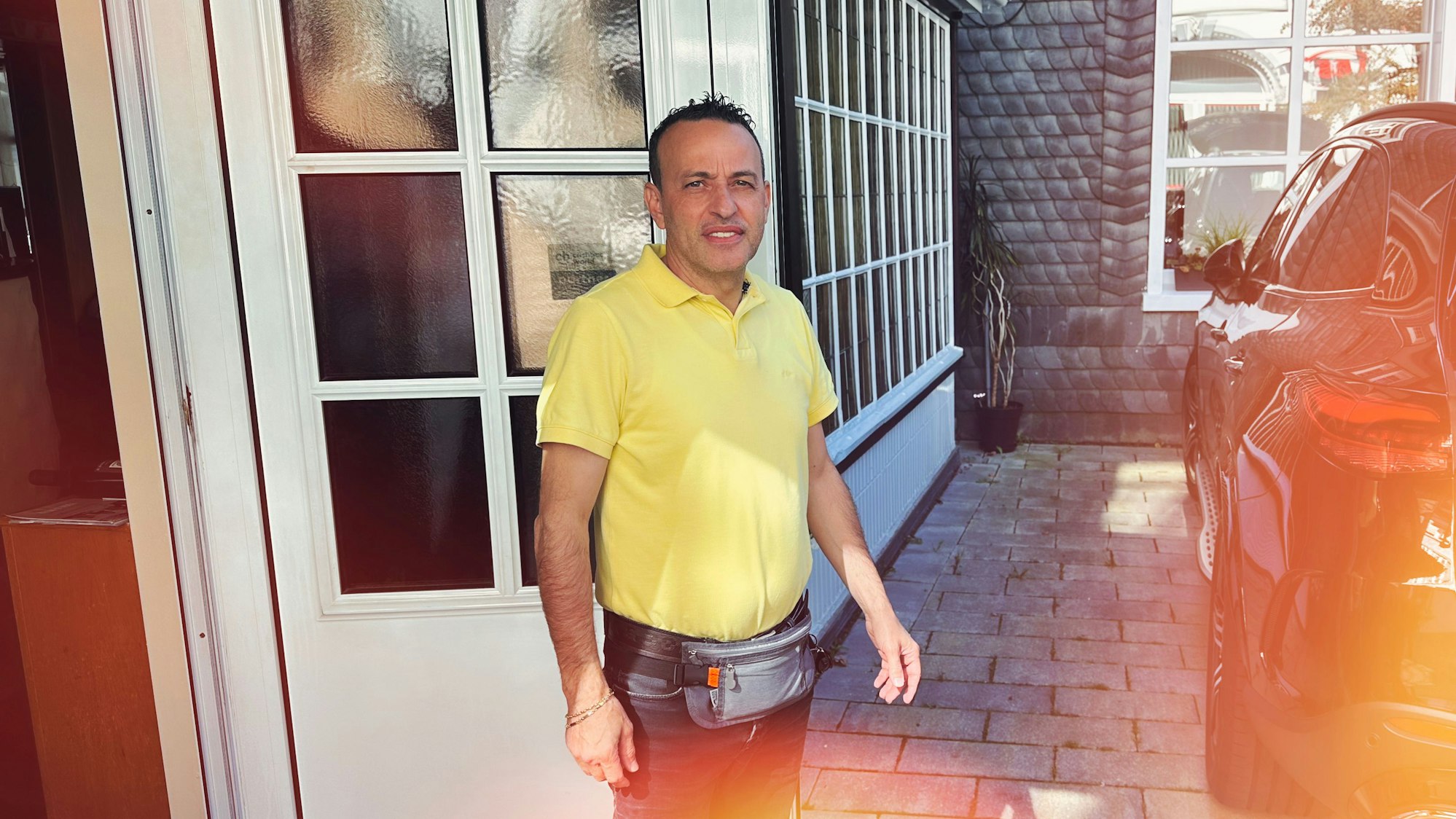 Gaetano Copia vor seiner Pizzeria in Gummersbach. Rechts vom Eingang parkte das Pizza-Taxi, das im laufenden Betrieb gestohlen wurde.