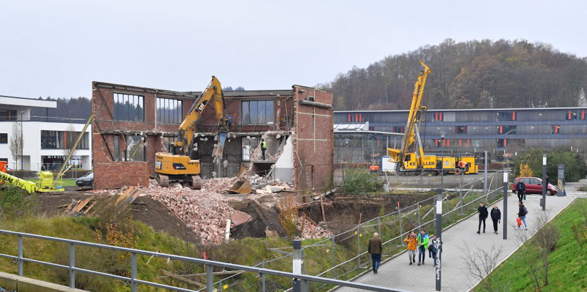 Nachdem beinahe zwei der vier Außenwände abgetragen waren, konnte ein Spezialbagger auch die Zwischendecke Stück für Stück abbrechen. Stützen sorgen derweil dafür, dass die beiden verbliebenen Wände nicht zusammenbrechen. Um die Halle herum sind Aufschüttungen von acht Metern nötig, berichtet Korthaus. Und weil der neue Baukörper eine unregelmäßige Form habe, müsse der Baugrund verbessert werden.