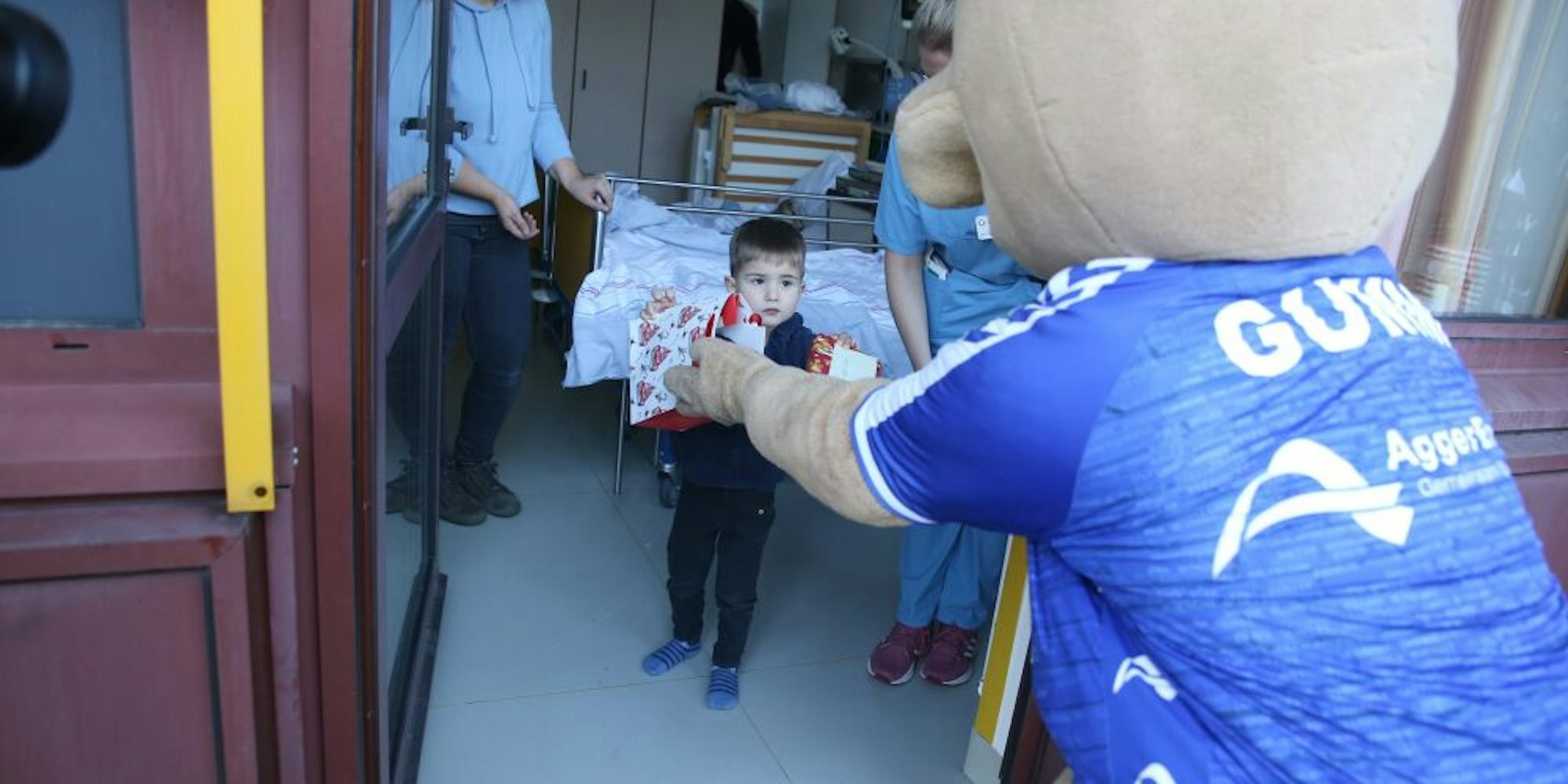 Zum zweiten Mal in Folge muss Gummi draußen bleiben und darf die bei den Heimspielen des VfL Gummersbach gesammelten Geschenke nur vom Balkon aus vorsichtig in die Zimmer reichen, wo ihn die Mädchen und Jungen mit Assistenzärztin Viviane Bender schon erwarten. Begleitet wird Gummi von Rebecca Timm, der Schwester von Handballprofi Marcel Timm, die im Krankenhaus ein Soziales Jahr absolviert.