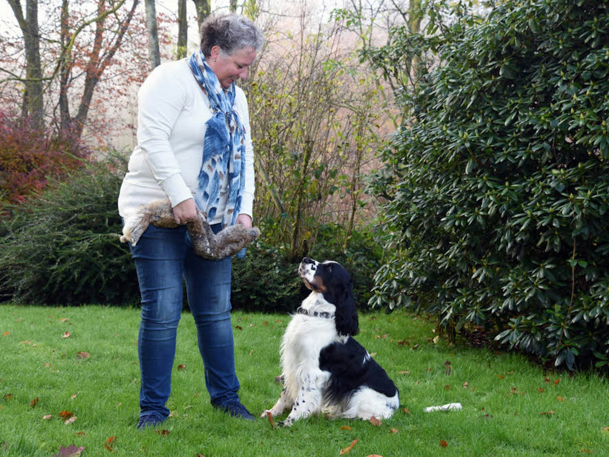 Dustin vom Schieferberg wird bei der Arbeit Duke gerufen. Und Duke hatte gerade ein paar Tage Pause. Umso begeisterter schnuppert er am Felldummy, als Regina Kind das Übungsteil aus der Kiste nimmt. Das Übungsfell wird abgelegt, Duke erhält sein Kommando, spurtet los und bringt den Felldummy umgehend zu Regina Kind zurück. Was hier im Garten der Familie ganz mühelos wirkt, ist das Ergebnis von viel Geduld, von einer Hundeschule für Jagdhunde und dem Austausch mit anderen Jägern, die ebenfalls ihre Vierbeiner selbst ausgebildet haben sowie mit den Mitgliedern der oberbergischen Gruppe des Jagdgebrauchshundevereins.