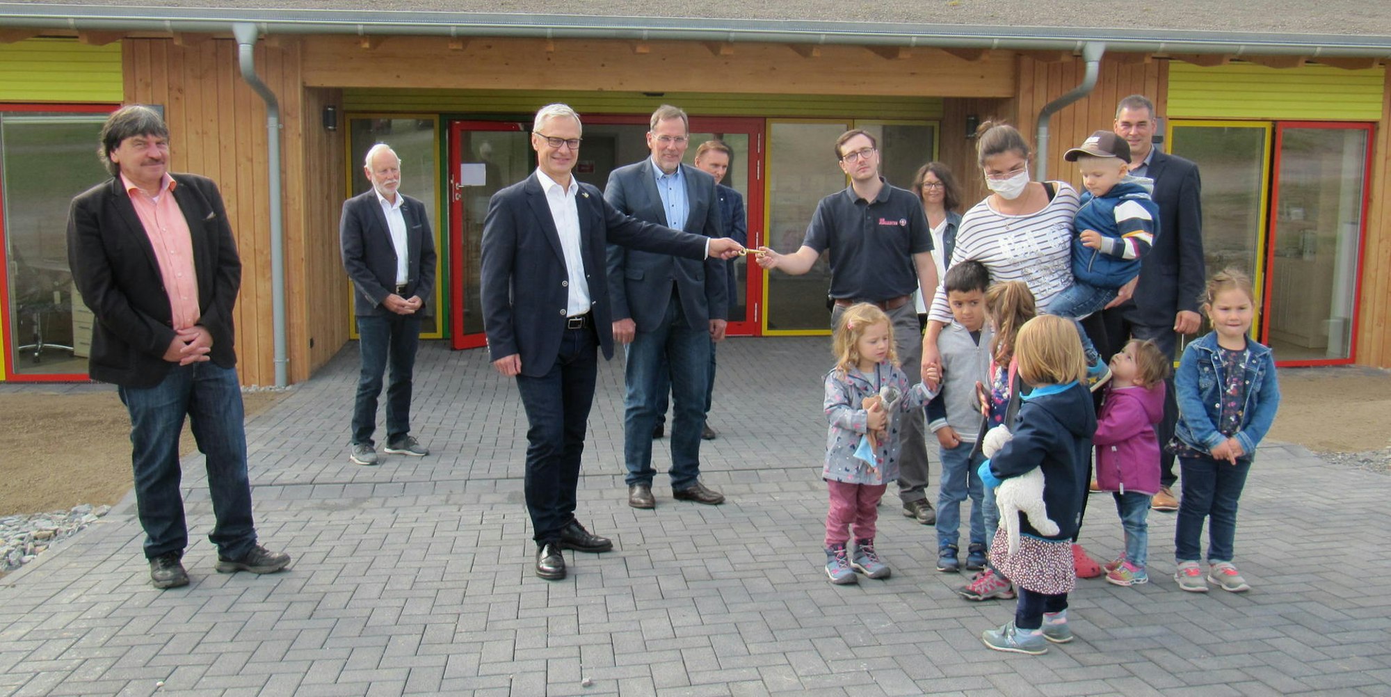 Eröffnung des neuen Kindergartens: Bürgermeister Dr. Georg Ludwig übergibt den Schlüssel an Kita-Leiter Julian Gilsdorf.