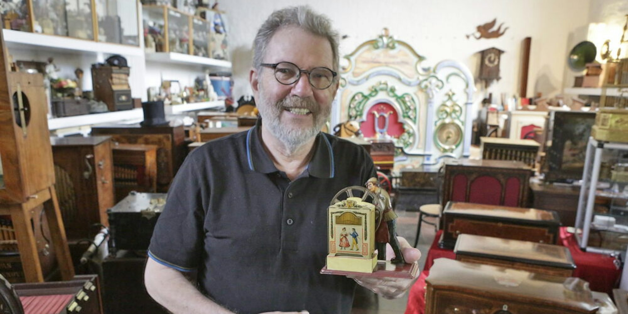 In seinem privaten Museum im Kempershöhe – in der kleinen ehemaligen evangelischen Kirche – sammelt er Drehorgeln, selbst spielende Instrumente und Spieluhren. „300 sind es inzwischen“, erzählt er. Ganz kleine, aber auch große mechanische Instrumente gibt es zu entdecken.