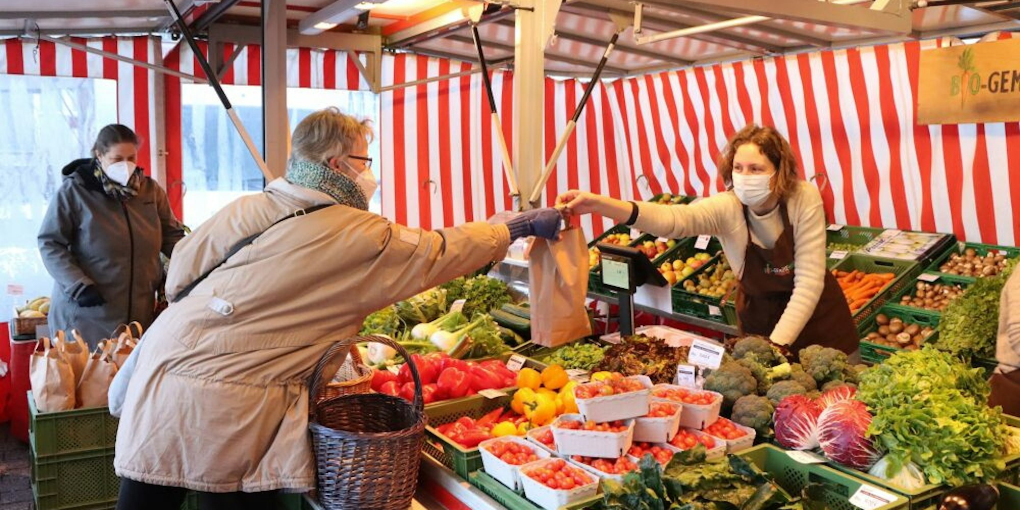 Auf der anderen Seite des Marktes hat Monika Schurrer vom Bio-Gemüsehof live2give (leben um zu geben) bei Betzdorf ein Zelt aufgebaut, um darin ein riesiges Sortiment Obst und Gemüse in Bio-Qualität anzubieten, dazu Backwaren aus Bio-Vollkornmehl aus der hauseigenen Bäckerei. Das meiste stamme aus Eigenanbau, einiges aus der Region, erzählt sie. Lediglich Südfrüchte kämen aus Katalonien: „Im Sommer fahren wir selbst jede Woche mit dem Kühlwagen dorthin, um Nachschub direkt vom Bauern zu holen.“ Zwei Gasheizungen halten das Zelt angenehm temperiert. „Wir heizen erst vor, bevor wir die Ware auslegen“, berichtet sie. „Das meiste ist nicht frostsicher und würde sonst verderben.“ Lachend meint sie: „Nur der Grünkohl hat kein Problem mit diesen Temperaturen.“ Die Bergneustädterin Irmgard Berger ist ganz begeistert: „Hier gibt es so tolle Sachen. Ich kaufe hier jede Woche ein.“