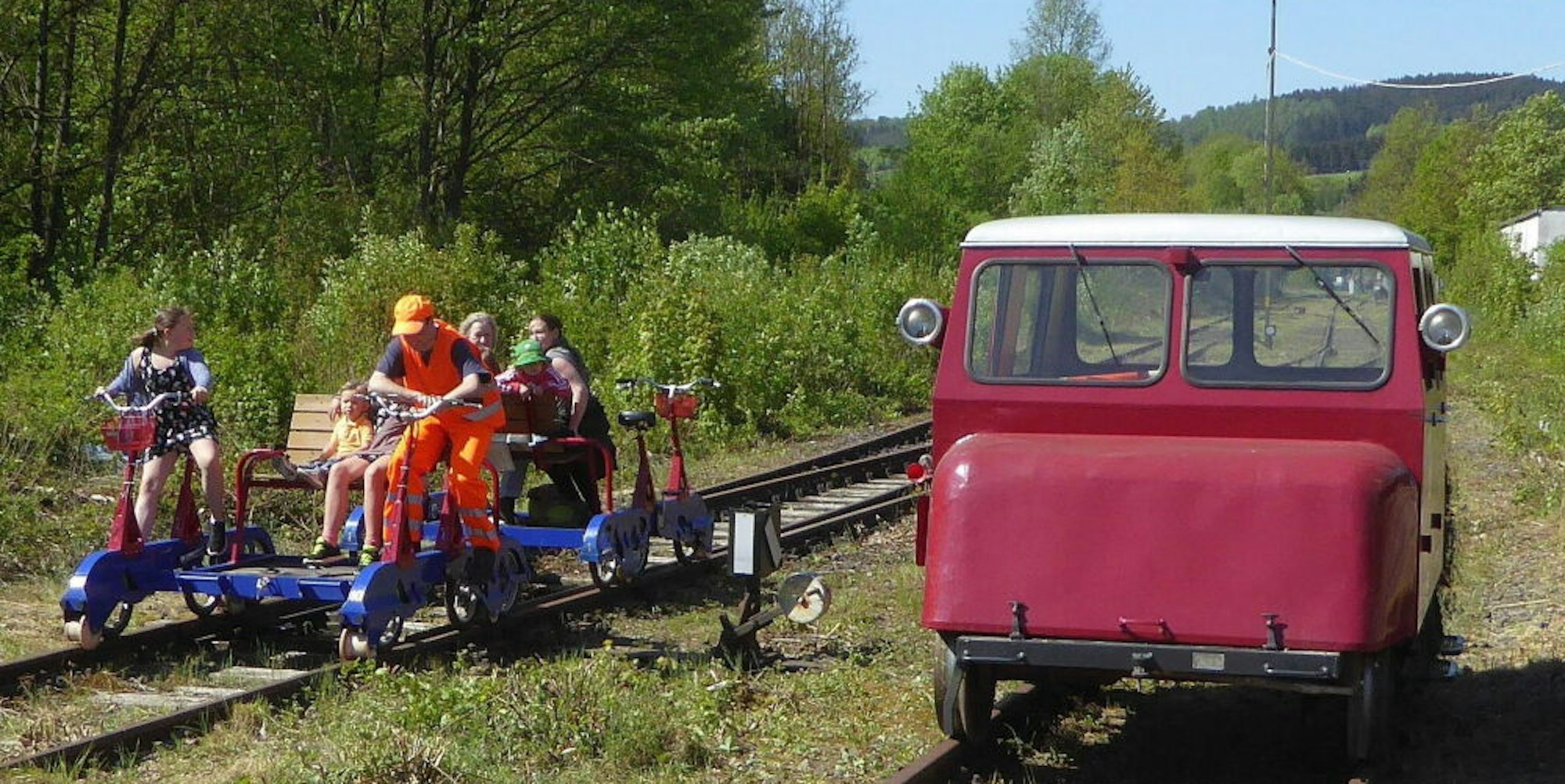 Draisinenverkehr am Morsbacher Bahnhof.
