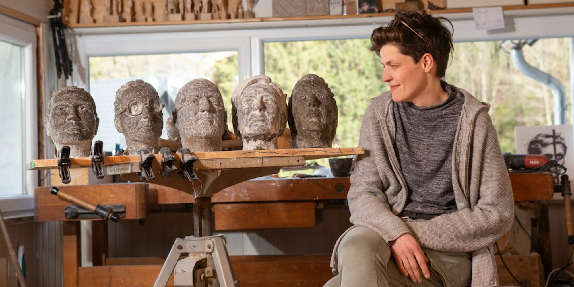 Die in Ton modellierten Köpfe werden in Zement gegossen. Anschließend schlägt sie die Gipsform ab.