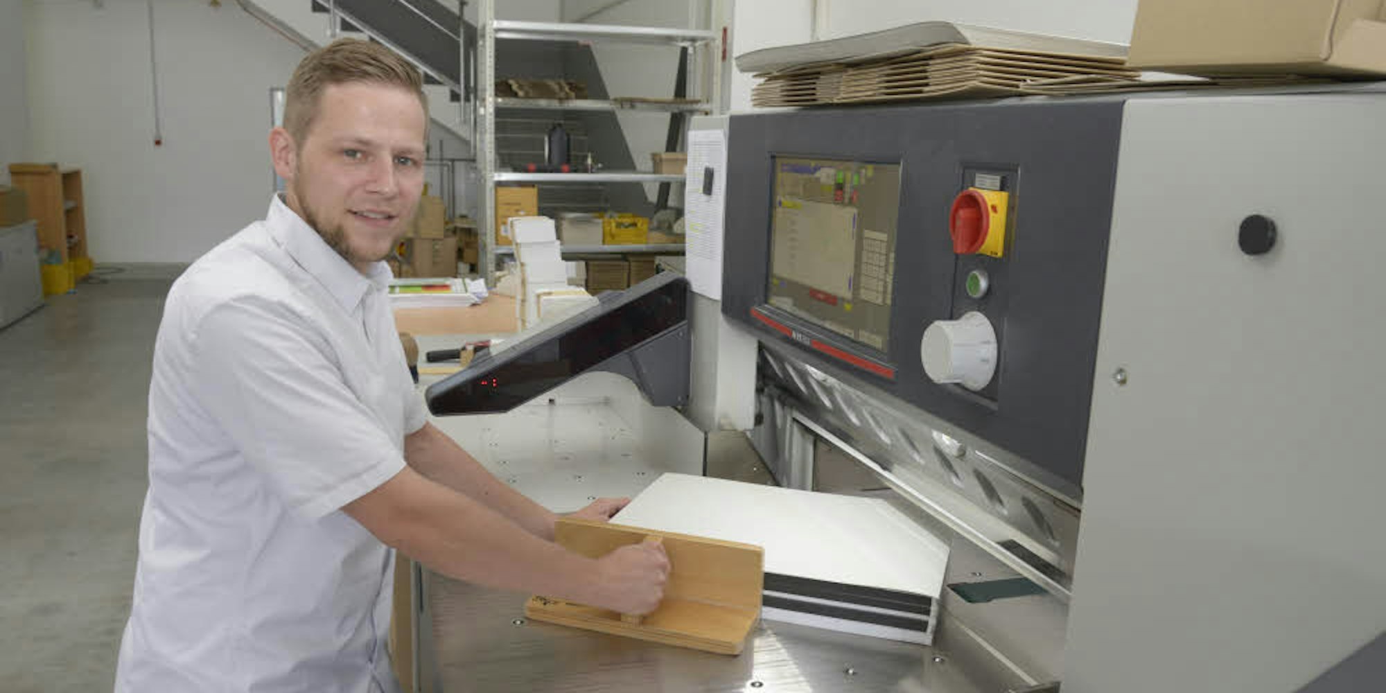 Jungunternehmer Nico Braun in seiner neuen Firma an einer Maschinen zum Schneiden und Falzen.