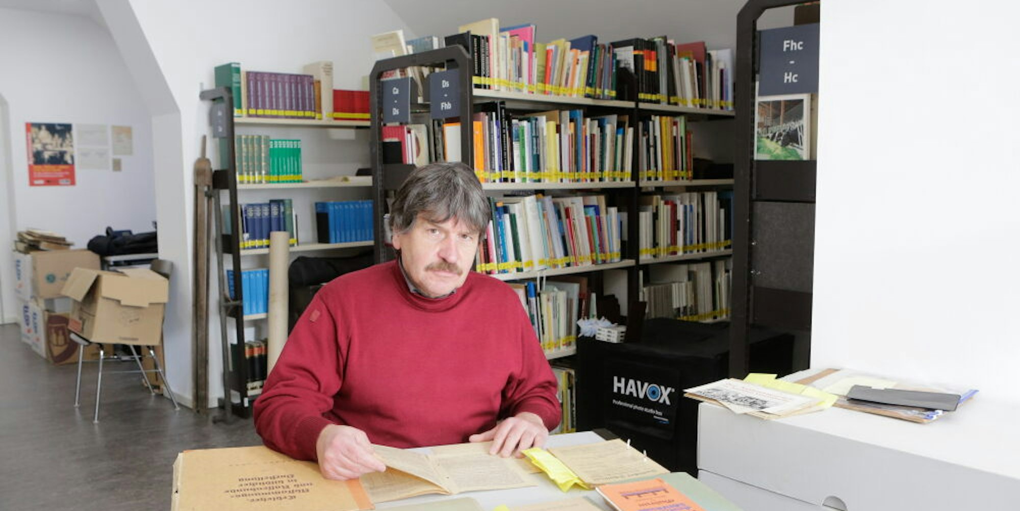 Der Leiter des Freilichtmuseums, Michael Kamp mit NS-Schrifttum aus der ehemaligen Thierer Schulbücherei.
