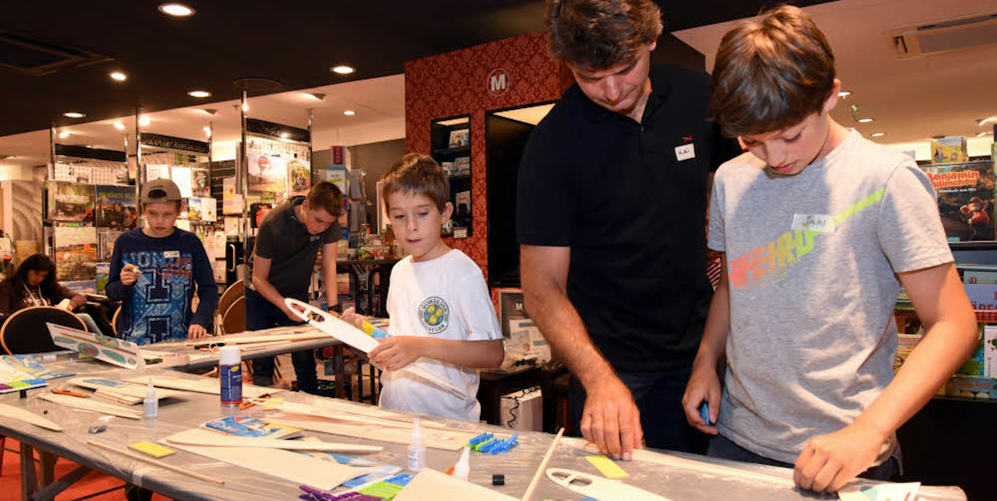 Gummersbach/Marienheide – Mit Kleber, Schere und weiteren Einzelteilen machen sich vier Jungen ans Werk. Sie bauen Modellflieger. Es ist Donnerstag, an diesem Tag fungiert die Mayersche Buchhandlung in Gummersbach als Bastelstube. Die Oberberger im Alter zwischen zwölf und 14 Jahren werden von Fred Grunow und Kai Oberlinger vom Modellflugverein RCF Marienheide angeleitet. Die wissen, wie’s geht, sind Experten für den Bau von Segelfliegern. Konzentriert lauschen Jan, Max, Ville und Neal den Erklärungen Grunows.