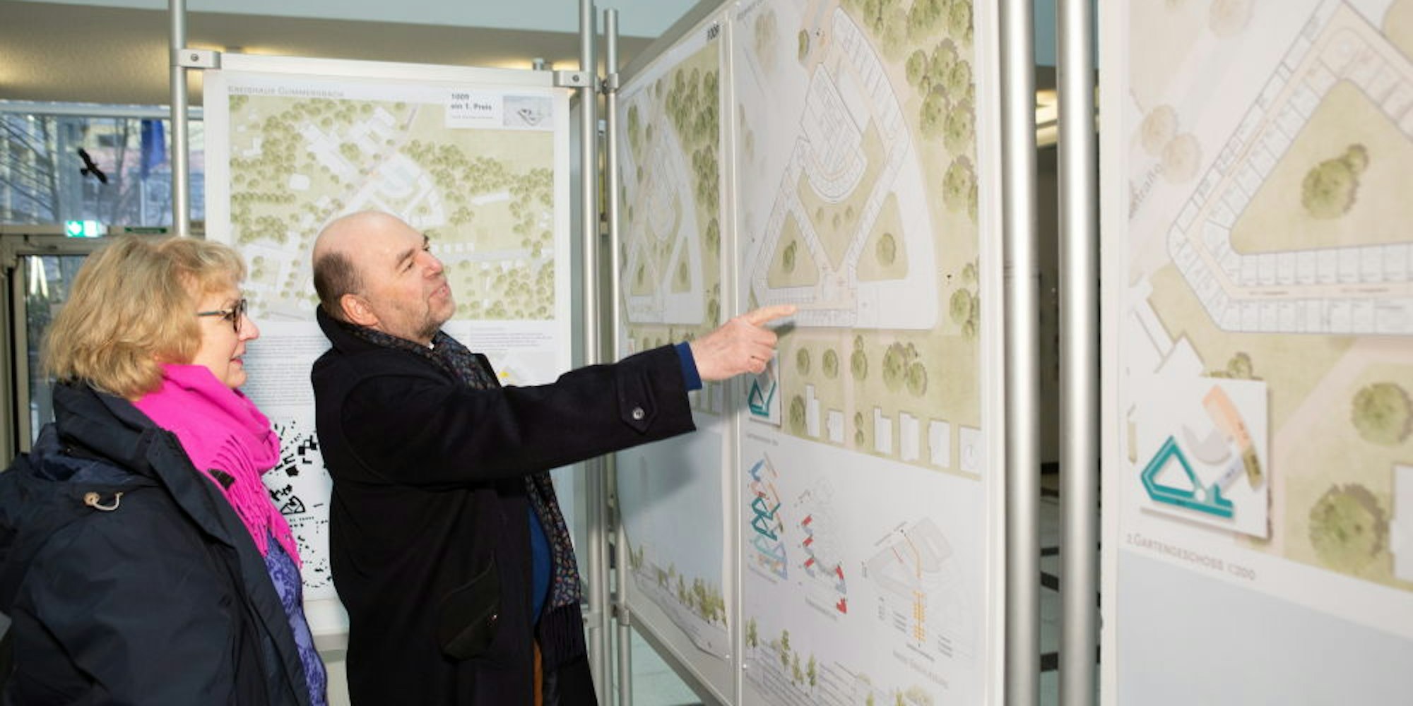 Der Entwurf Nr. 1008 mit seinen Würfeln? Nicht schlecht, finden die beiden Gummersbacher. Aber da müssten die Häuser am Wiedenhof abgerissen werden, weil sonst nicht genügend Platz sei, sie sollten nach Ansicht des Ehepaars aber erhalten bleiben. Am Ende des Rundgangs ist der Siegerentwurf des Berliner Büros Hascher Jehle Design eindeutiger Favorit. „Das ist eine gute Lösung“, findet Friederike Riemenschneider. Die geschwungene Form der Neubauten mit ihrer Terrassierung passe sich hervorragend der Landschaft und auch dem Hochhaus und dem Rundbau an. Besonders angetan ist sie von den begrünten Dächern.