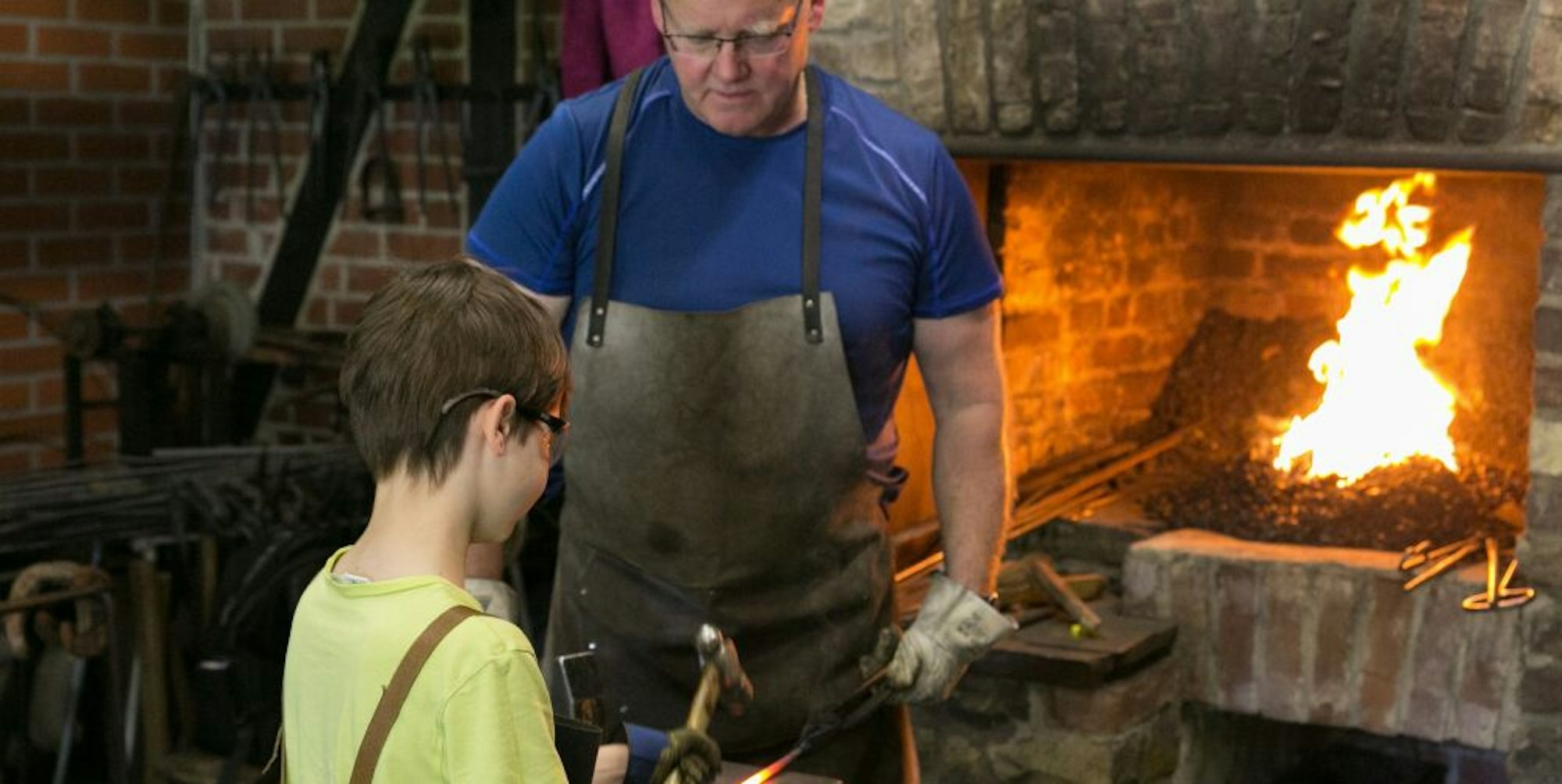 Schmied Klaus Dieter Braun zeigt Felix Gräfe, wie man eine Speerspitze schmiedet.