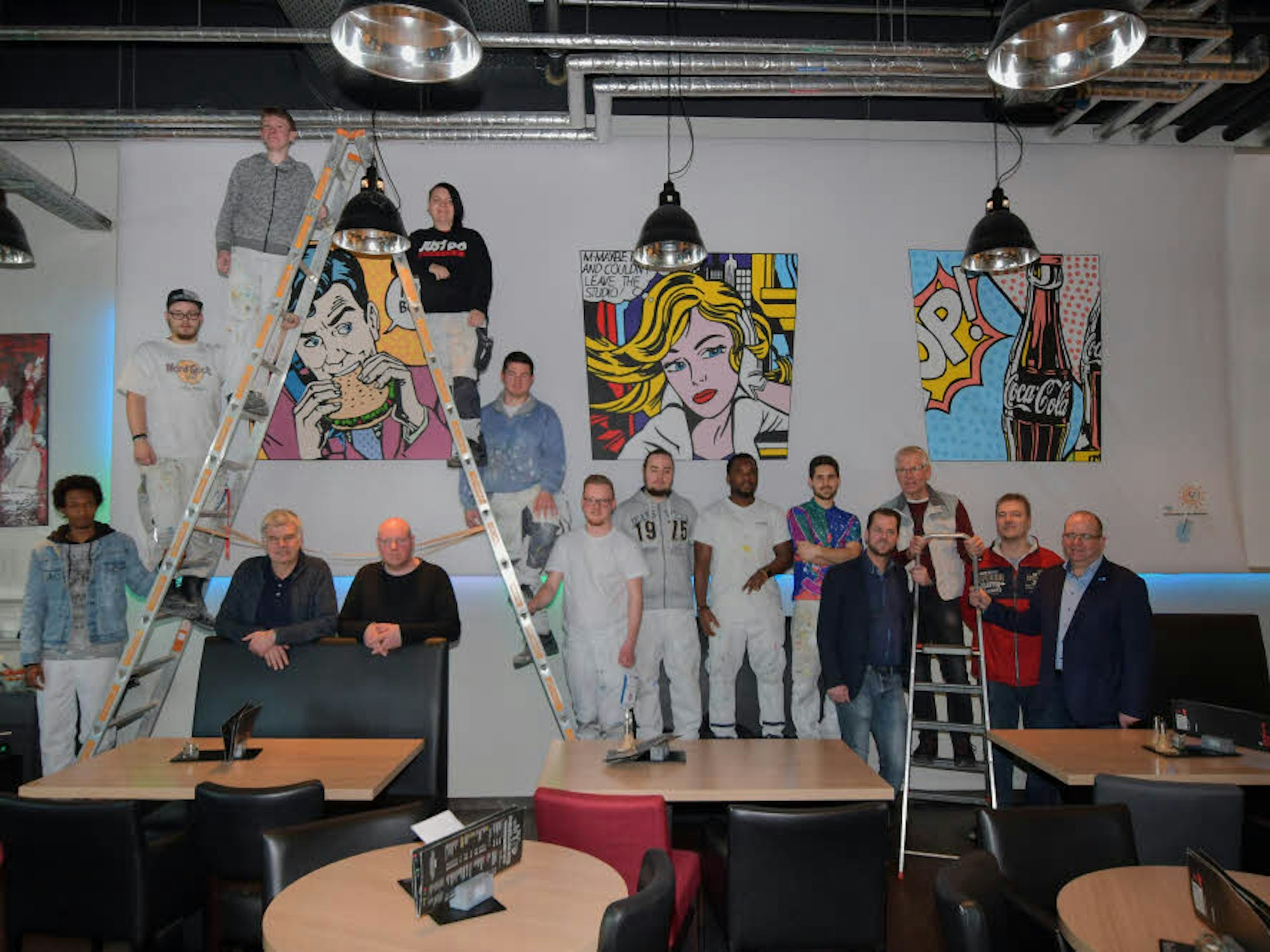 Die große Leinwand im Restaurant haben acht Maler-Azubis in zweimonatiger Arbeit mit Pop-Art-Motiven versehen.