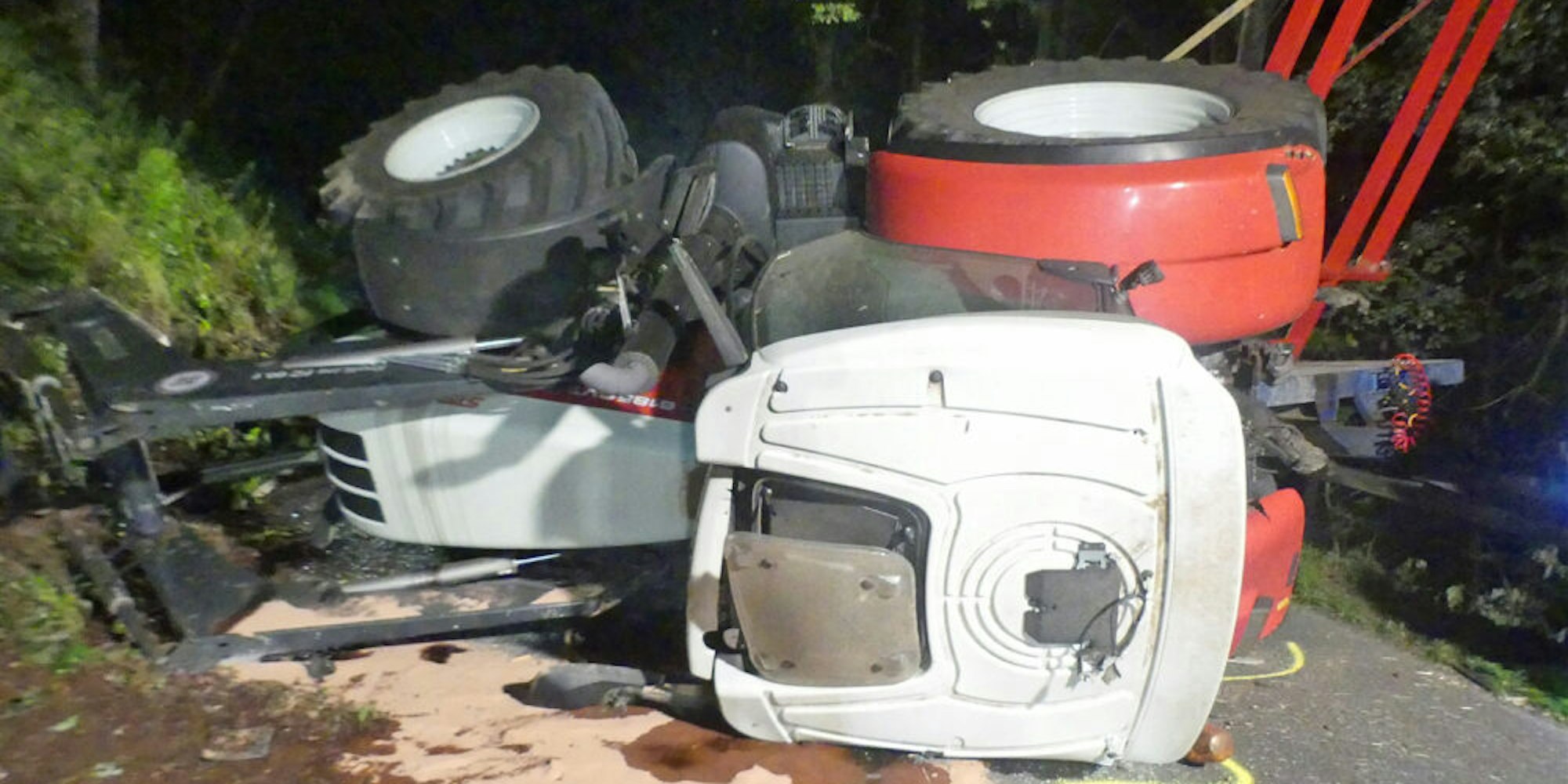 Das Gespann, so die Polizei, sei zunächst von der Fahrbahn abgekommen, gegen die Böschung geprallt und danach auf die Seite gekippt. Dabei habe sich der Anhänger gelöst. Dieser stellte sich quer, der Hänger und der umgestürzte Traktor blockierten die Fahrbahnen. Es dauerte etwa drei Stunden, bis die Unfallstelle geräumt war und die Polizei die Straße für den Verkehr freigeben konnte.