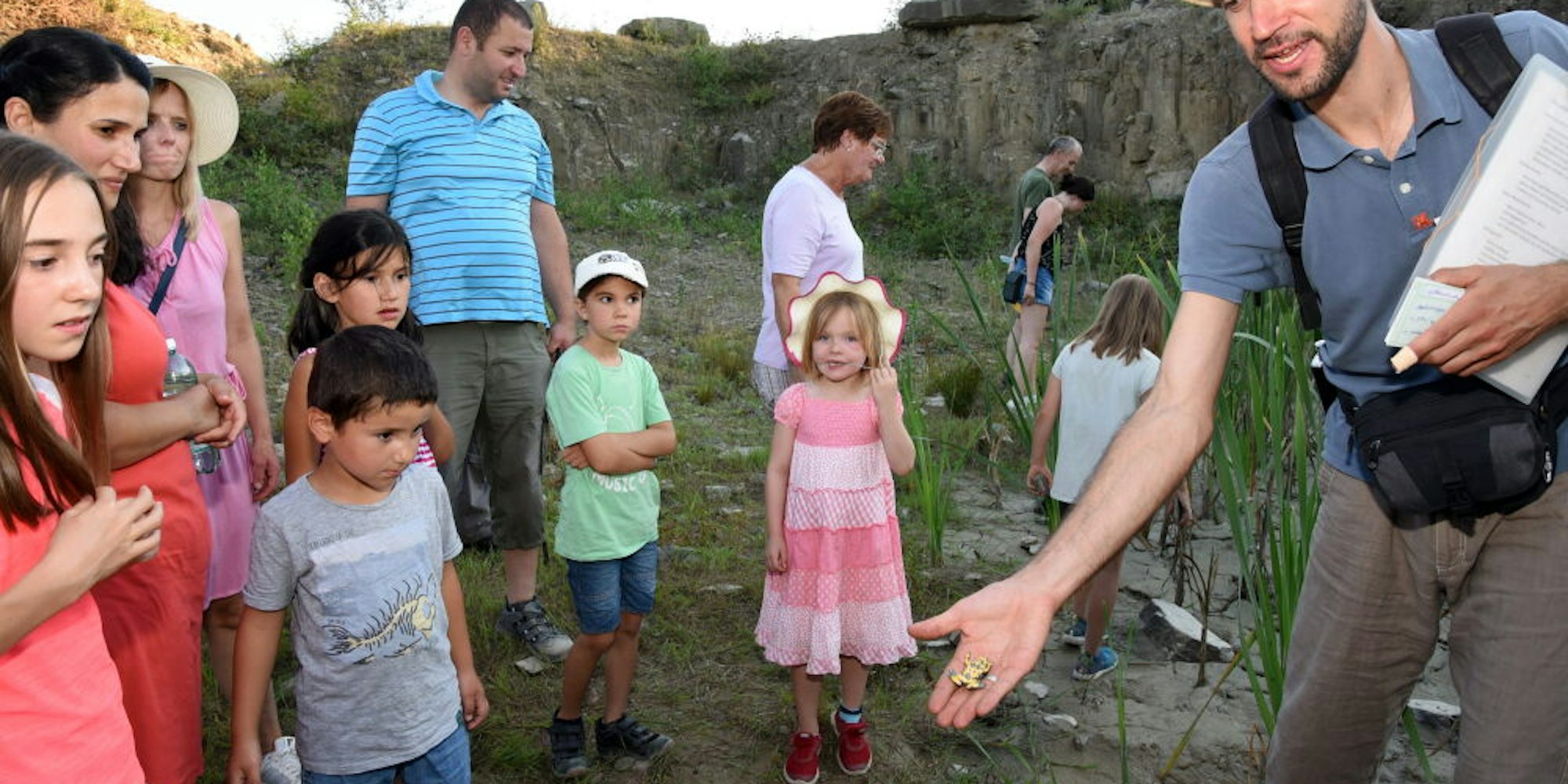 Vor allem die Kinder sind neugierig auf die Lebewesen, das Sedimentgestein und die Fossilien. So entdecken die Teilnehmer etwa die Waldeidechse, die bis zu 18 Zentimeter lang ist und Steinplatten und Felsblöcke als Versteck nutzt. Oder auch die Gelbbauchunke, die bevorzugt gut gesonnene Flachgewässer zum Laichen bevorzugt, „hier in den Steinbrüchen nutzt sie auch Tümpel und wassergekühlte Fahrspuren“, beschreibt Schöllnhammer und präsentiert die Unke in seiner Hand (Foto). Zudem tarnt sich die Unke durch ihre braunfleckige Färbung auf der Oberseite perfekt im Gestein.