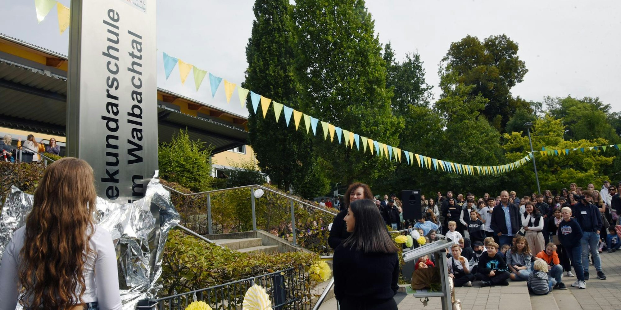 Ründeroth – Sekundarschule im Walbachtal – der neue Schulname prangt jetzt unübersehbar, schwarz auf silber, vor dem Gebäude auf einer großen Stele. Deren Enthüllung war nur einer von vielen Programmpunkten, als die Schule in Engelskirchen-Ründeroth am Samstag ihren 10. Geburtstag feierte.