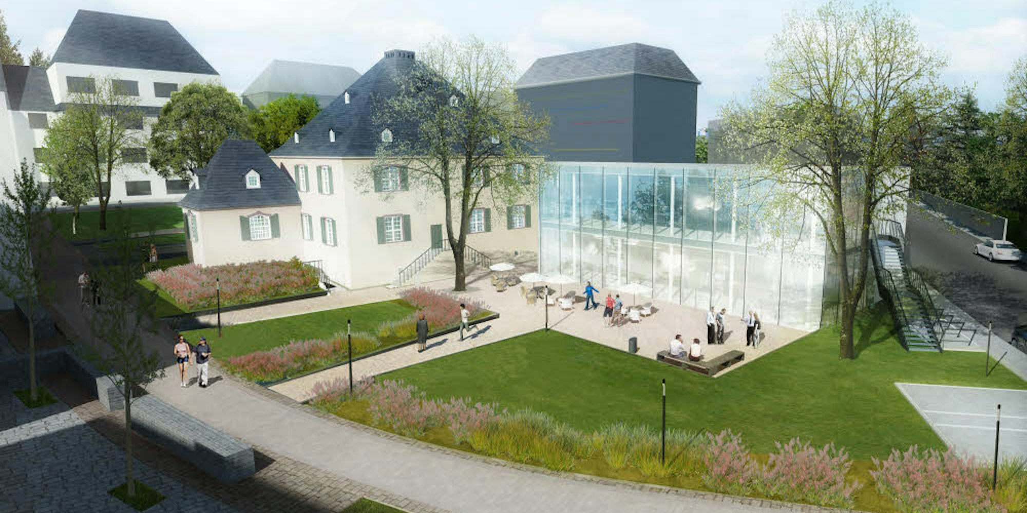 Zur Andienungsstraße hin (r.) sollen der gläserne Anbau und eine Hoffläche entstehen, umrandet von viel Grün.